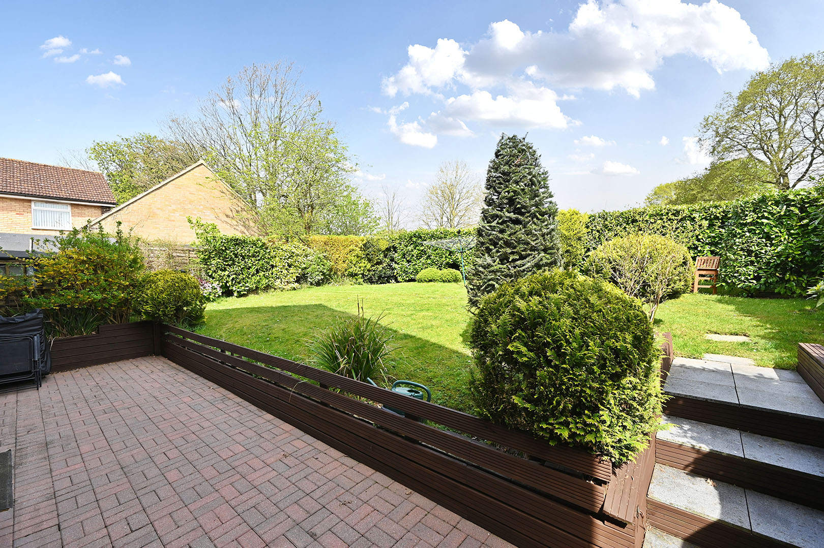 Block paved patio with steps leading to lawned area enclosed by hedging and gated side access with gate opening onto Kennington Recreation field .