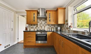 Good range of shaker style cupboards and drawers beneath mottled effect worktops with additional wall mounted units and larder style storage cupboard, door through to utility room, gas hob with low level oven and extractor fan over, integrated dishwasher, window to rear, resin sink with mixer tap and drainer, partially tiled walls.