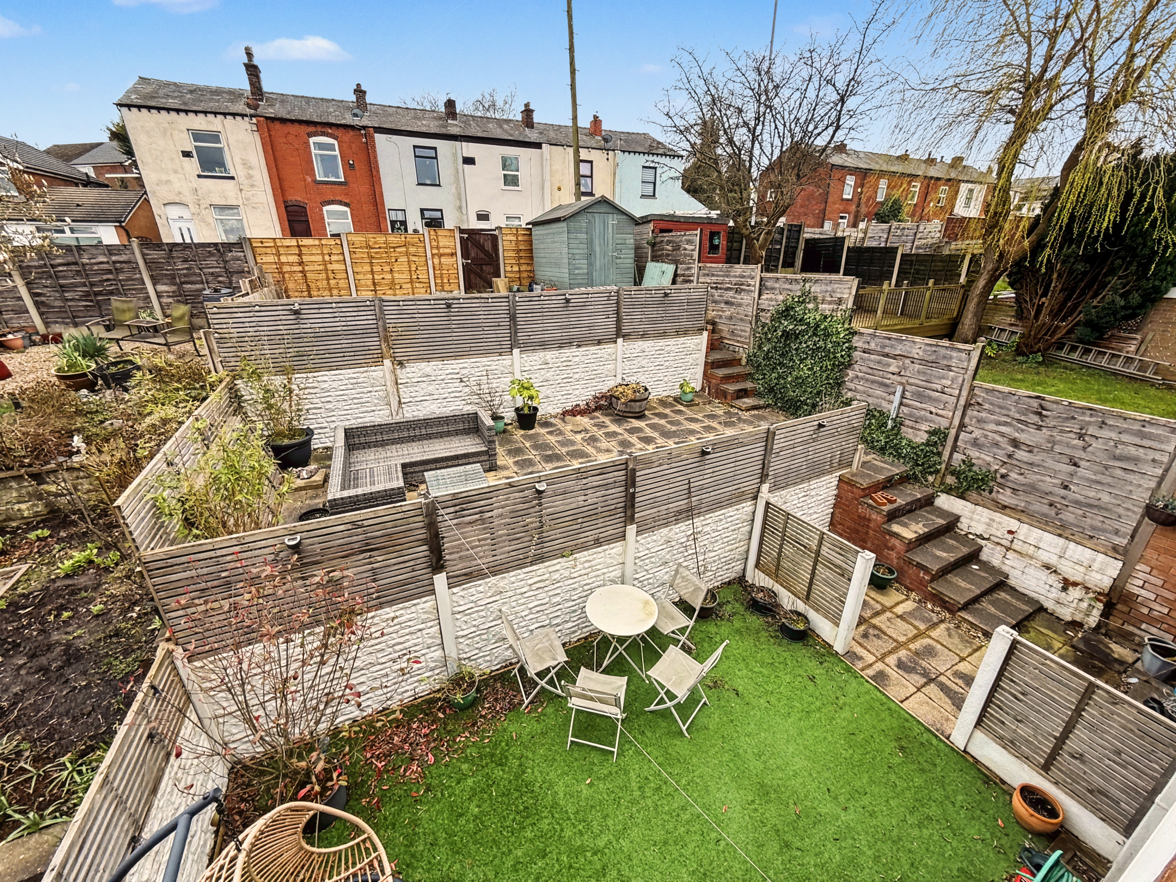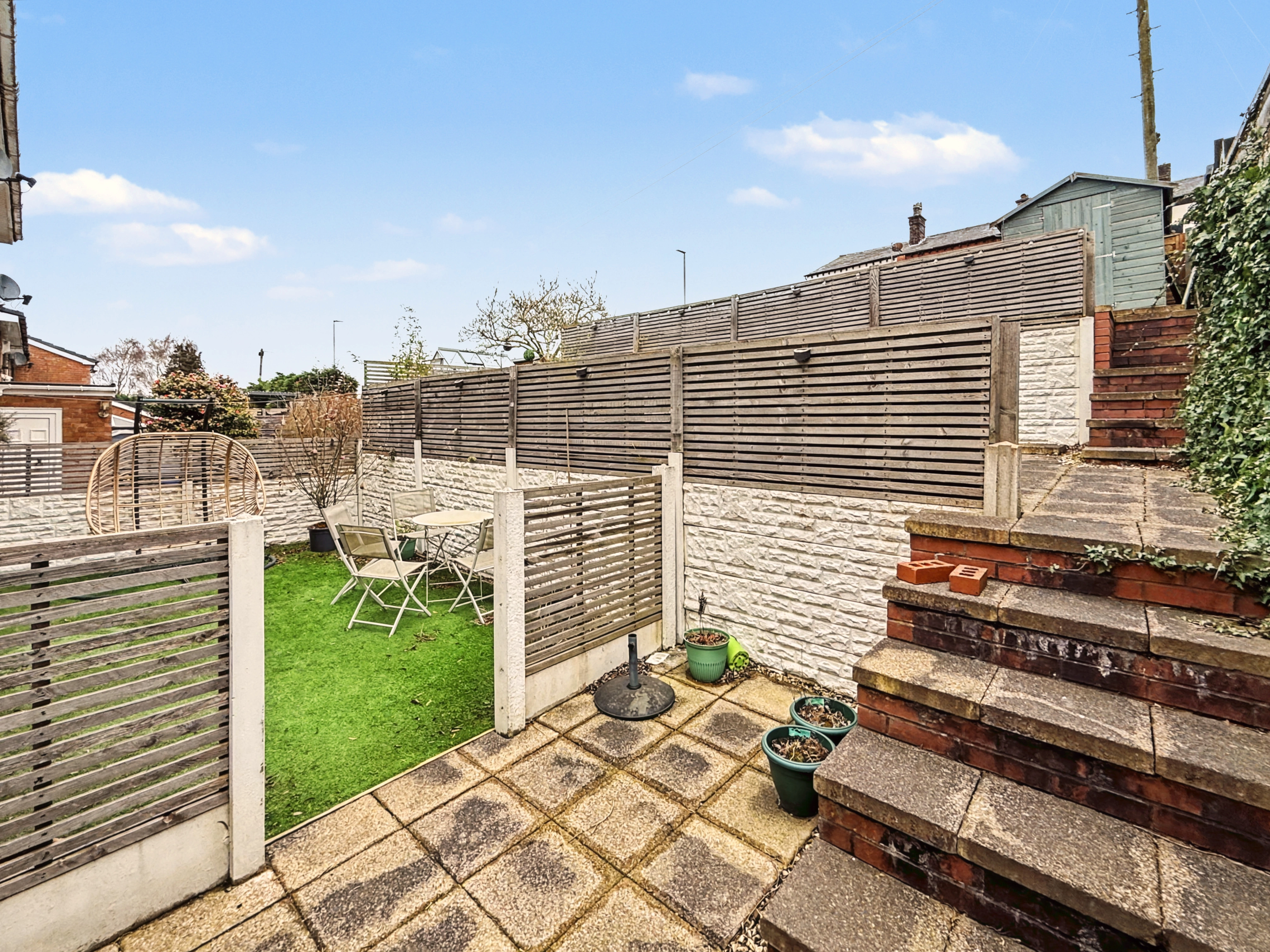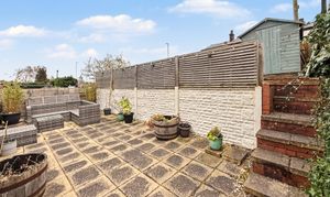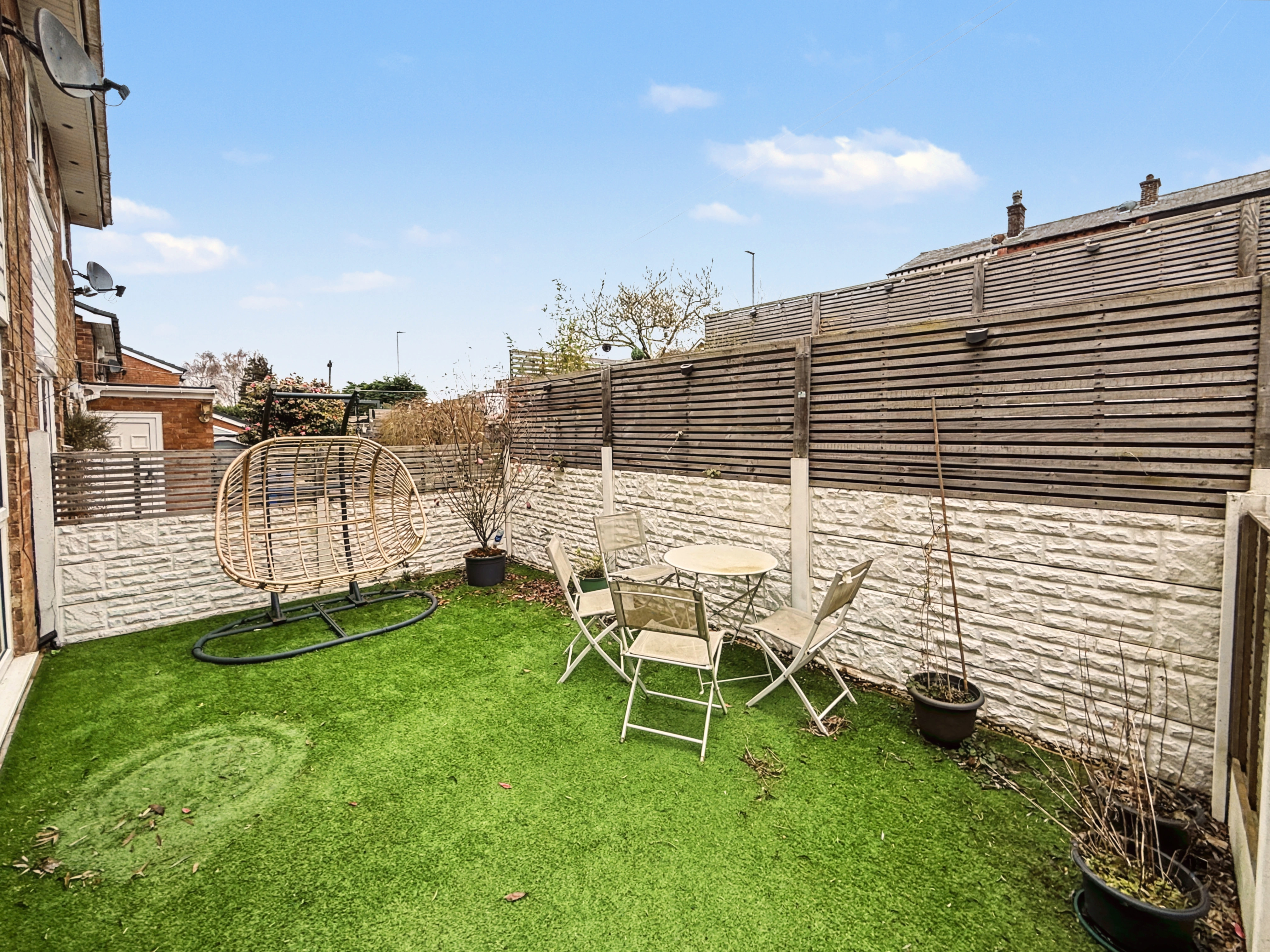 Externally, the front of the property features a lawned garden with planted border and a driveway providing off-road parking. To the rear, the garden is split into three tiers, creating a practical and well-arranged outdoor space. The lower tier provides a secure astro turf area ideal for children’s play, while the upper tiers offer patio seating areas and space for a garden shed.