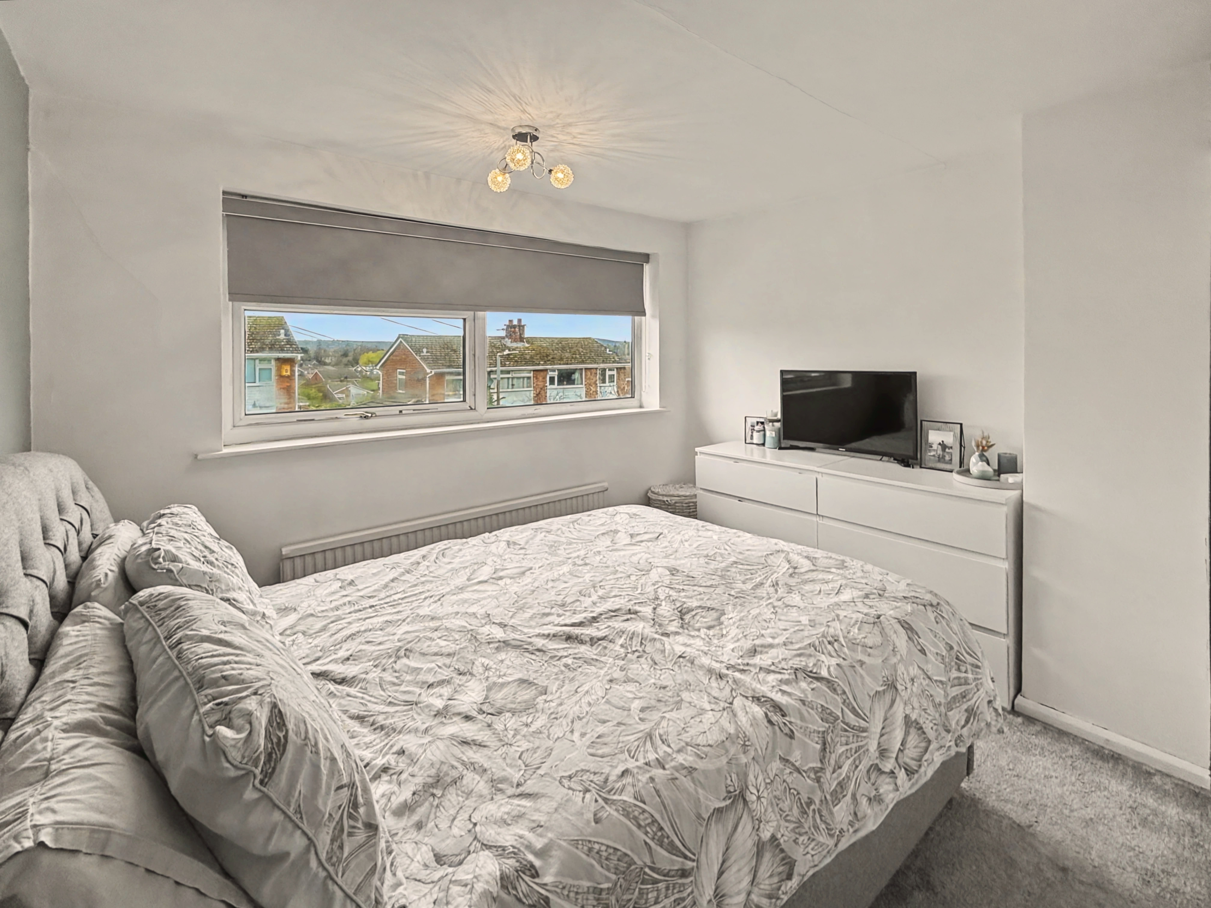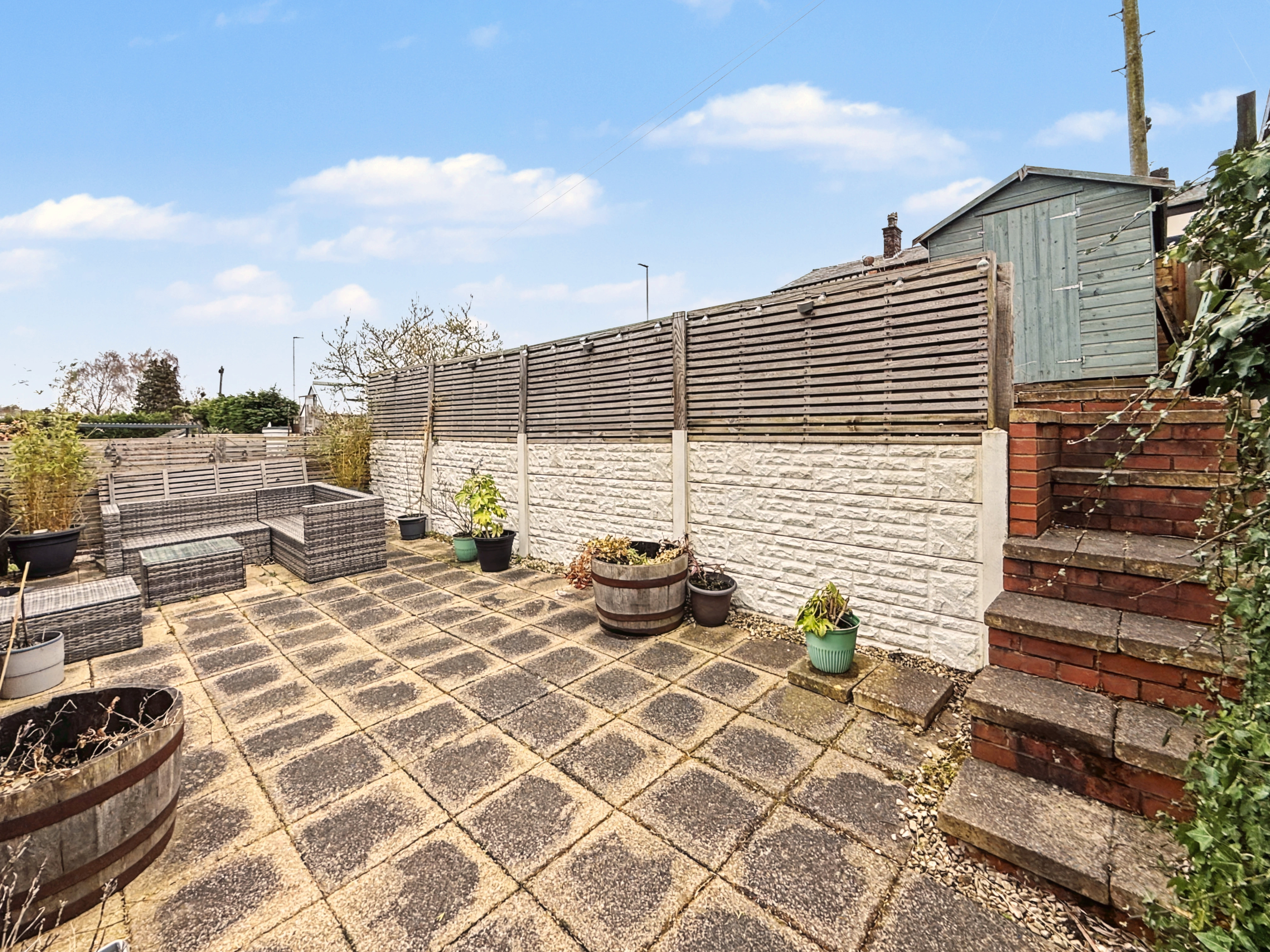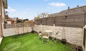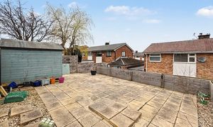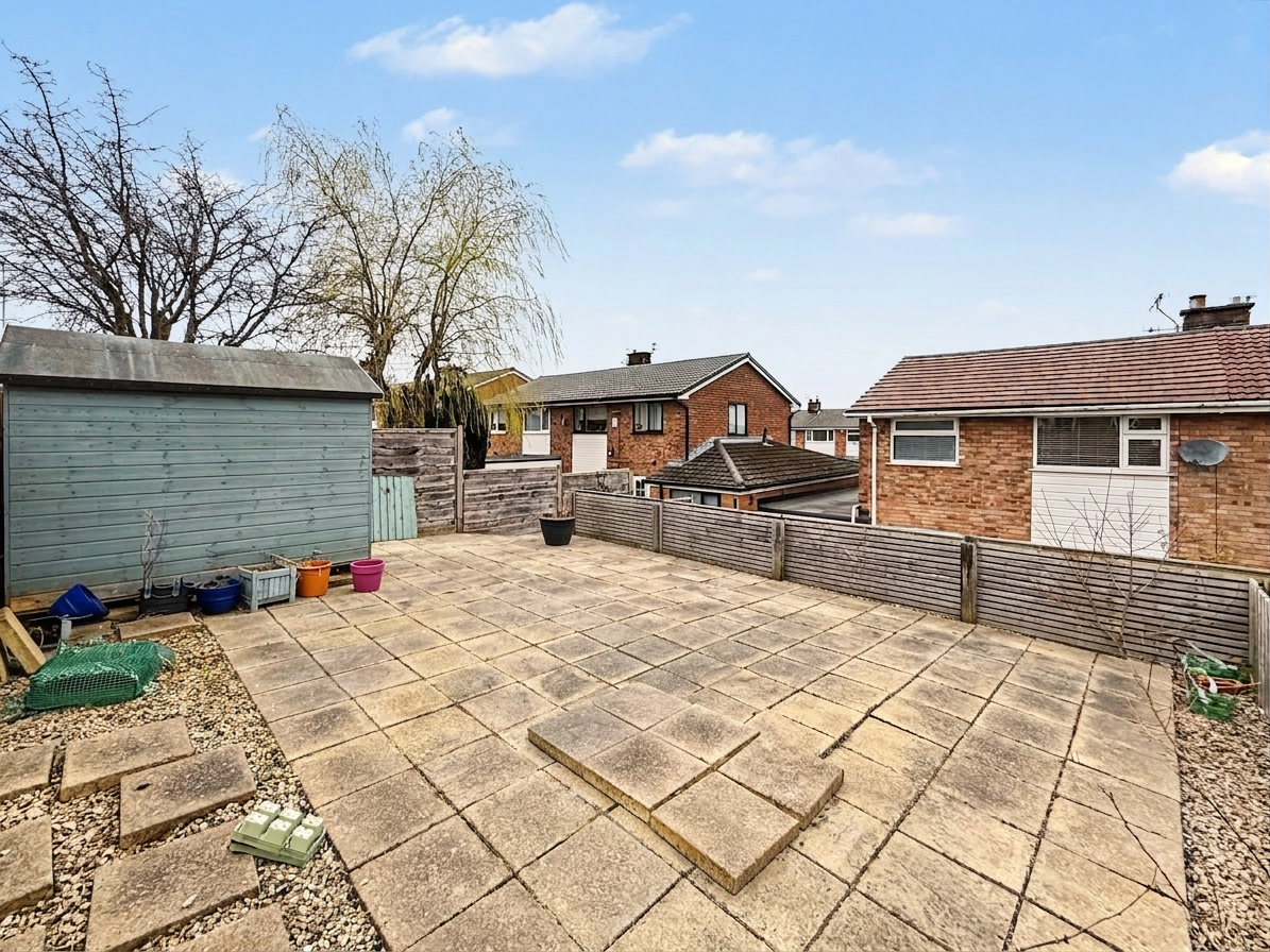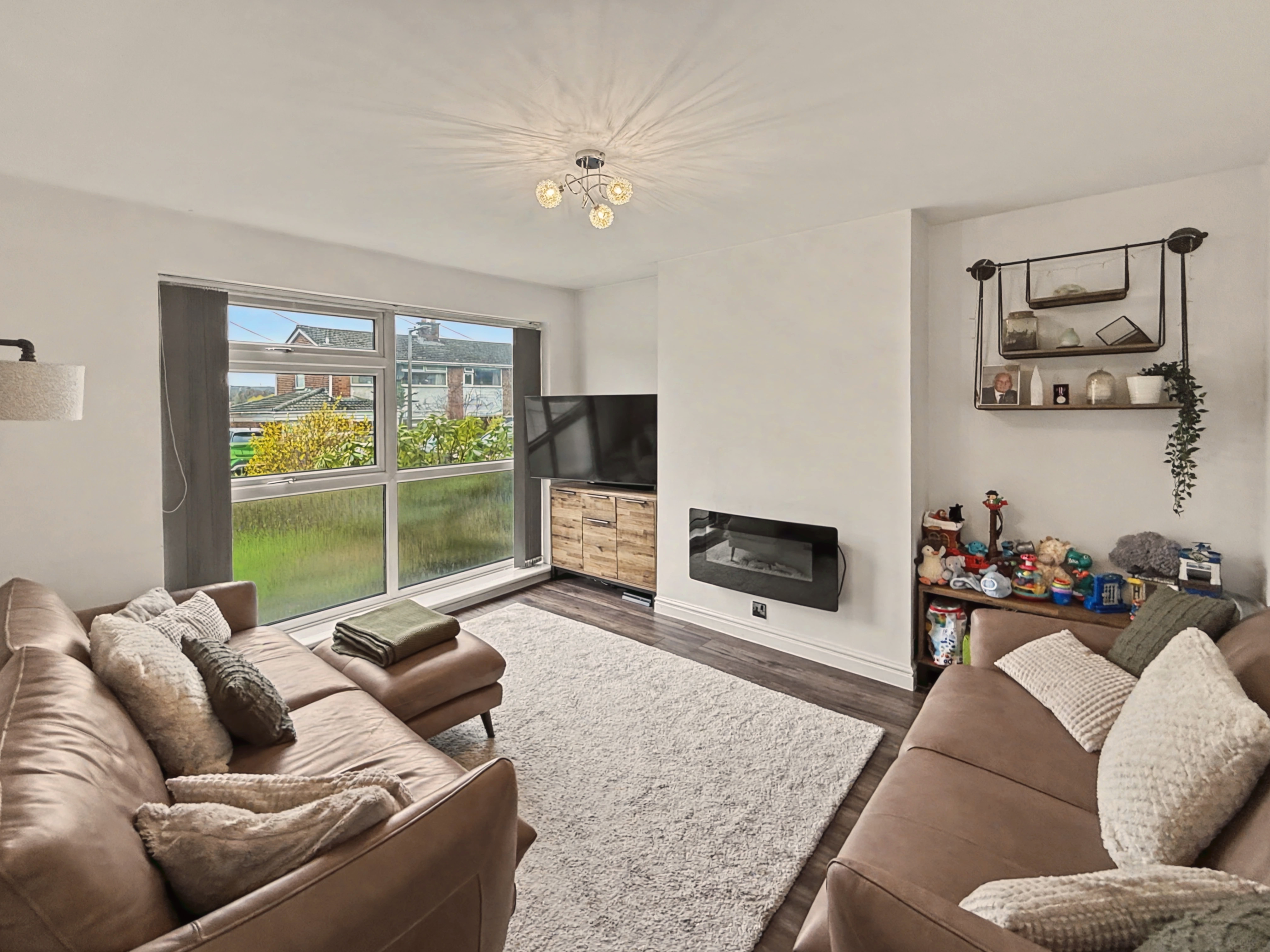 Externally, the front of the property features a lawned garden with planted border and a driveway providing off-road parking. To the rear, the garden is split into three tiers, creating a practical and well-arranged outdoor space. The lower tier provides a secure astro turf area ideal for children’s play, while the upper tiers offer patio seating areas and space for a garden shed.