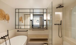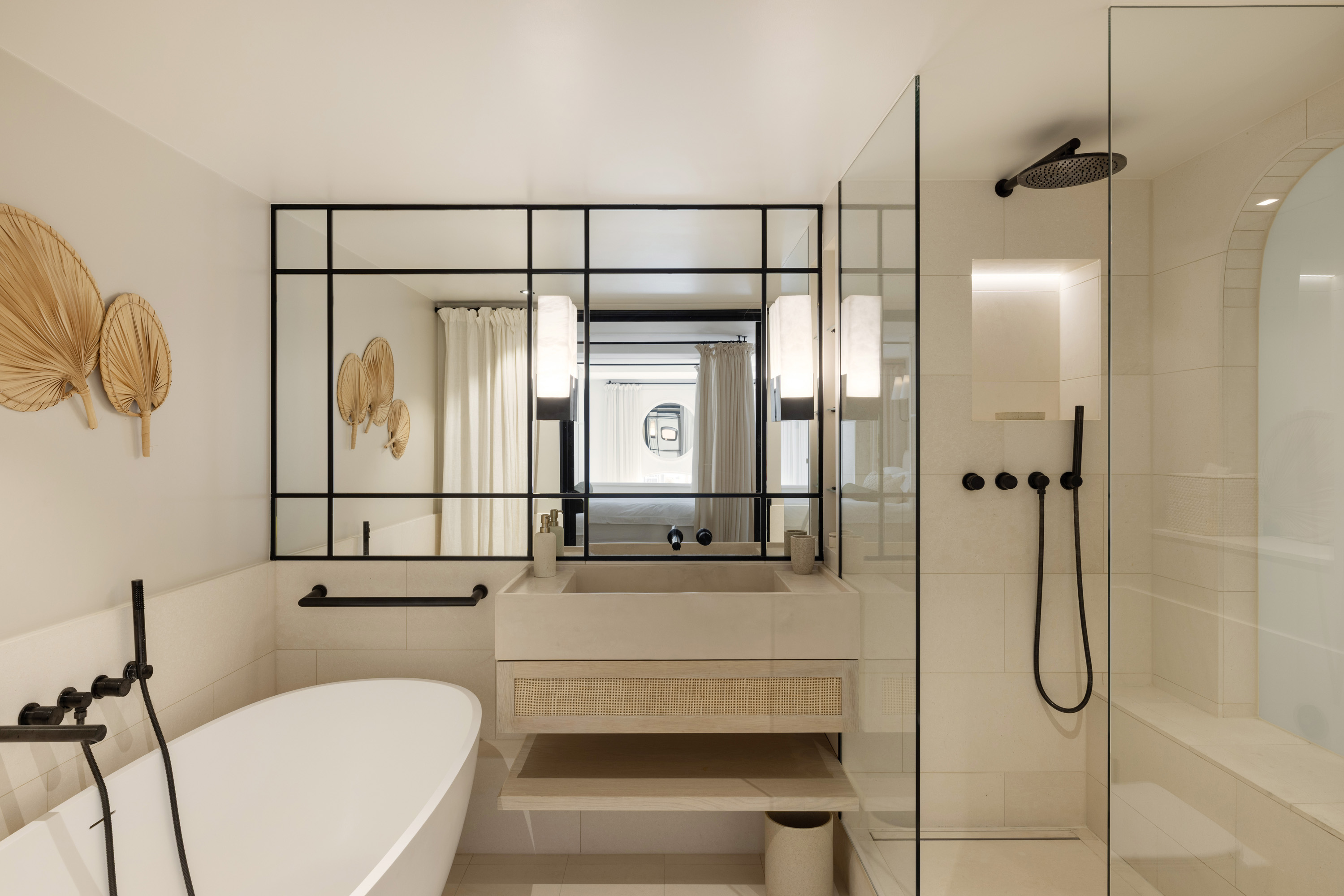 Ascending via the micro-cement staircase, the mezzanine level holds the main bedroom, bathroom, and a peaceful study area. Bespoke timber cabinetry provides a range of astute storage solutions, ensuring continued aesthetic appeal. Three large, circular mirrors positioned above each French double doors subtly reflect light and form, enhancing the sense of space and volume with effortless elegance.