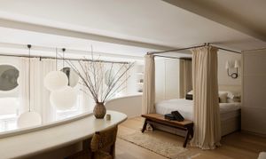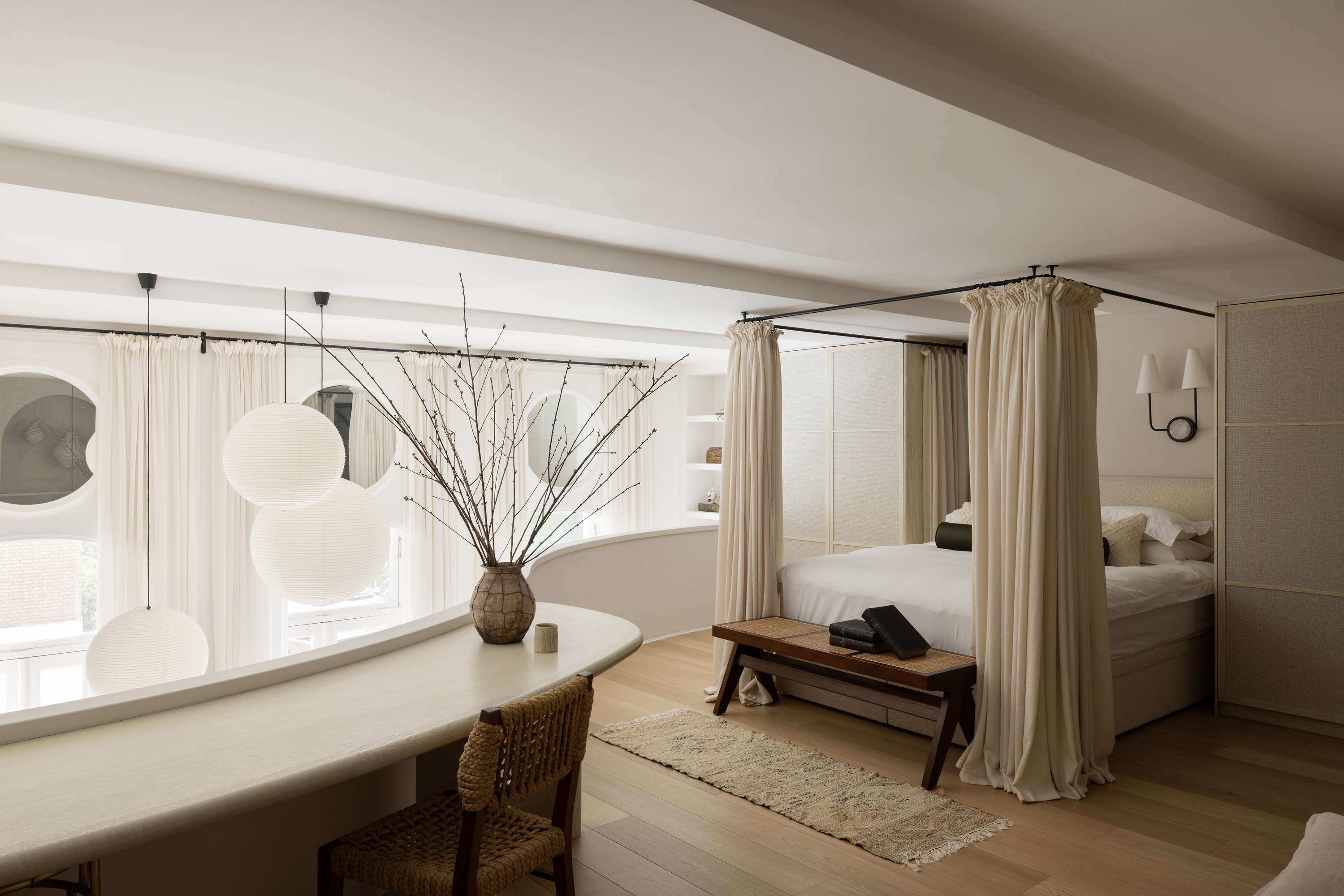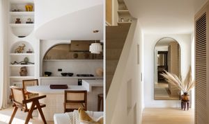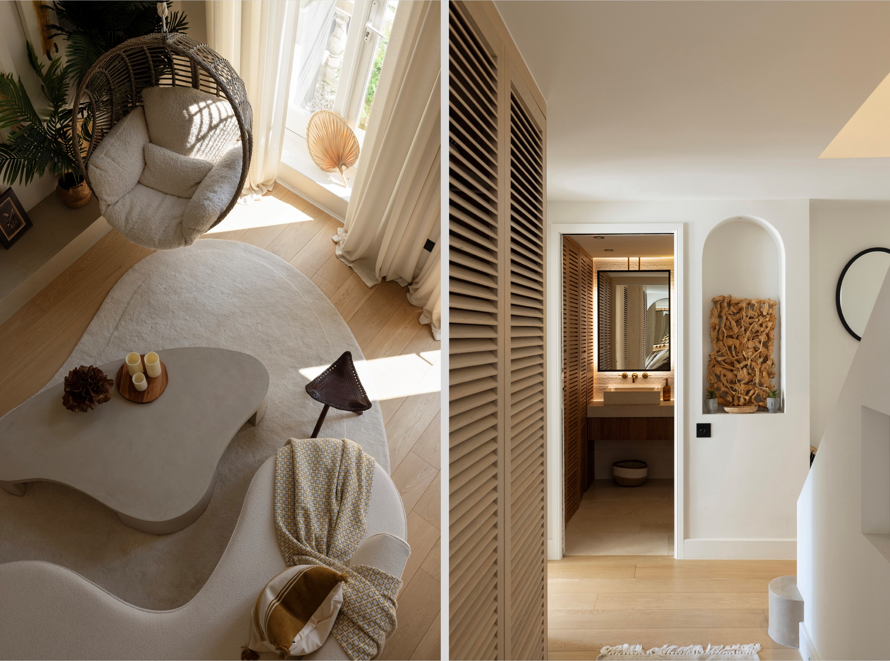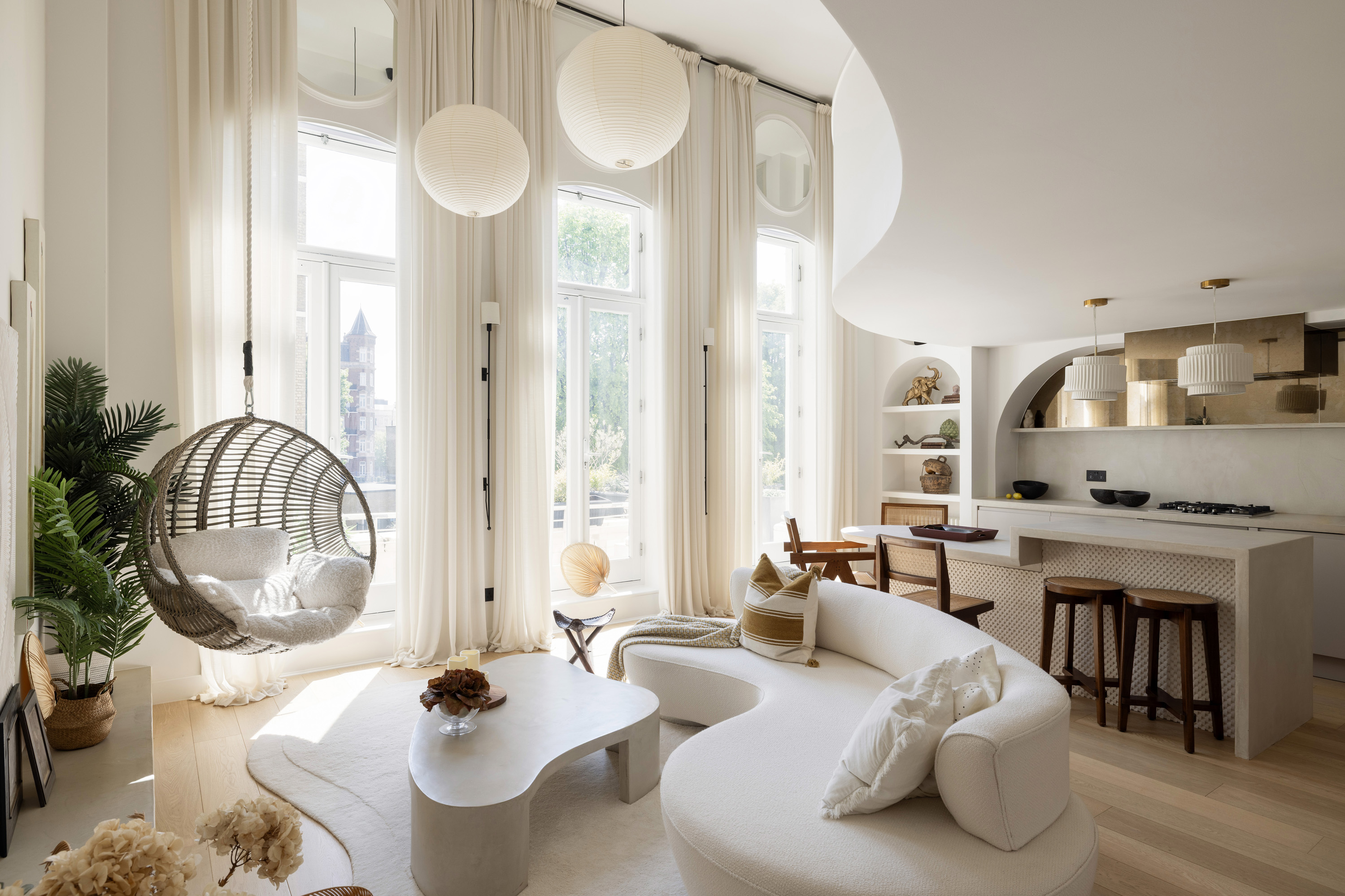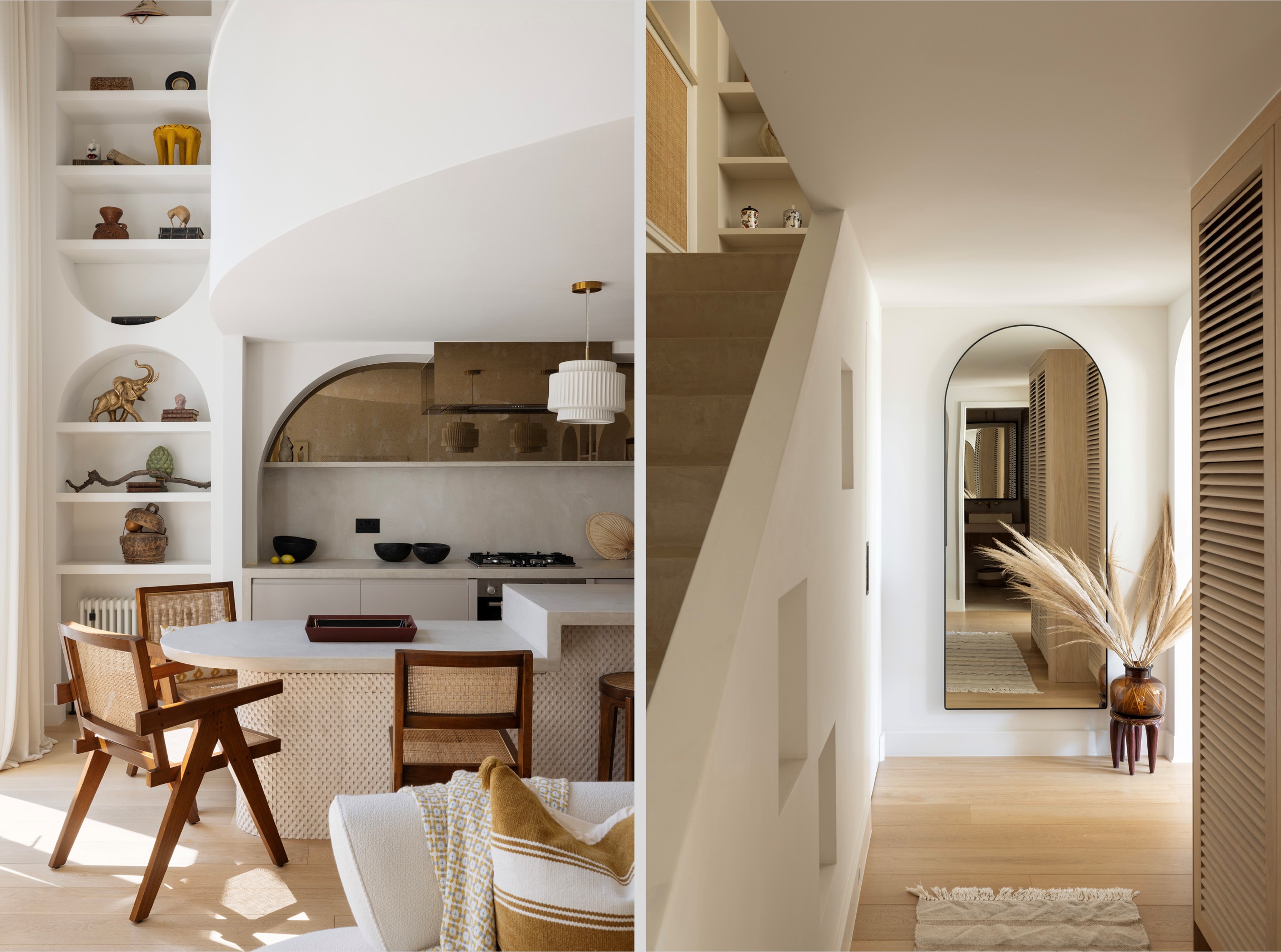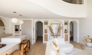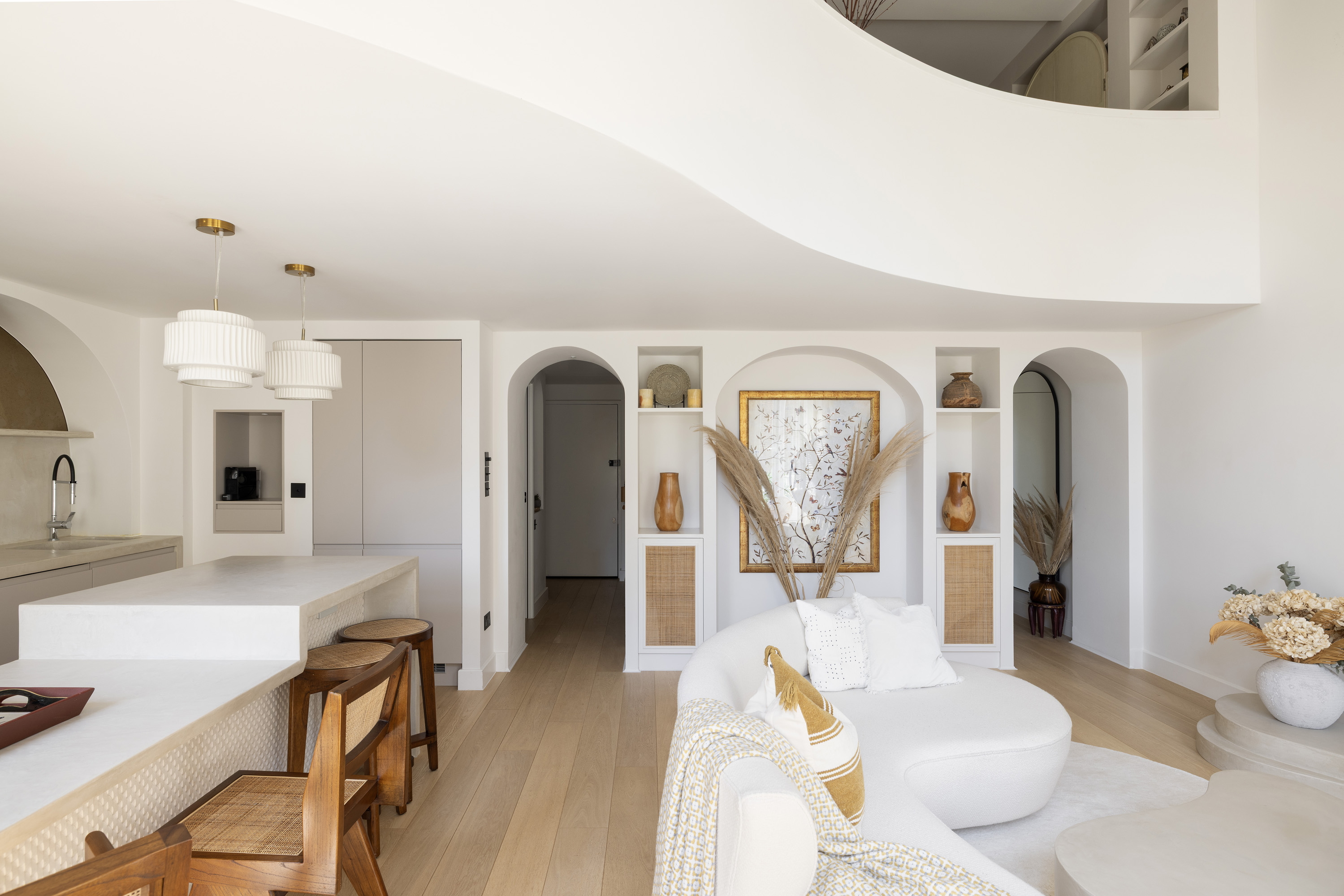 High ceilings soar to five metres in the main living space. Sculptural elements including arched niches, circular mirrors, and layered textures bring light and softness into the room. The curves of the mezzanine level echo throughout the interior, creating a visual language that is both fluid and grounding.