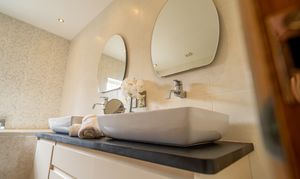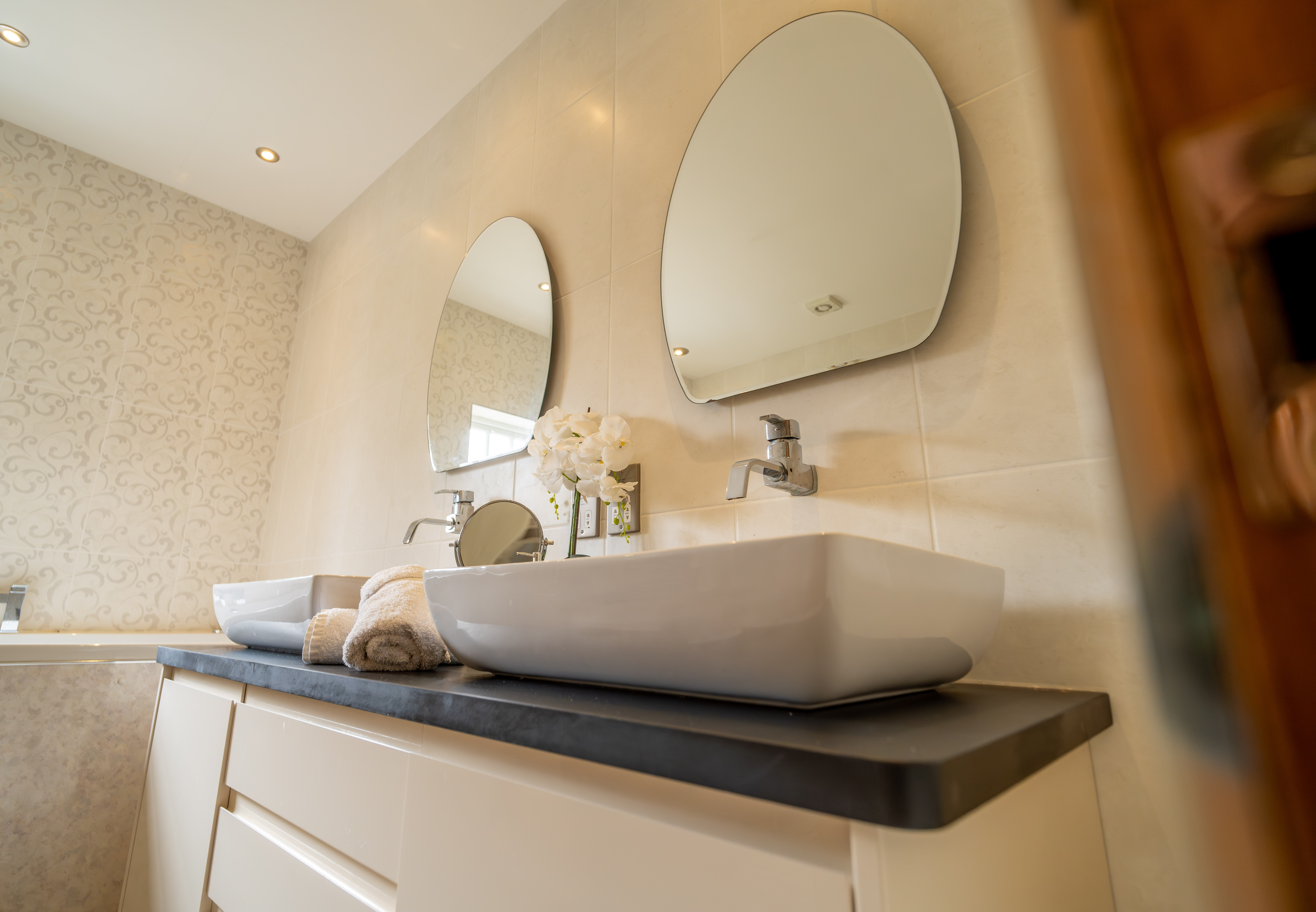 A luxurious four-piece suite featuring an oversized hydro-spa bath with jets, a double walk-in rainfall shower, and twin ‘his and hers’ vanity sinks set in a sleek unit. Tiled throughout, with heated towel rail, recessed lighting, and a double-glazed obscured window providing light and privacy.