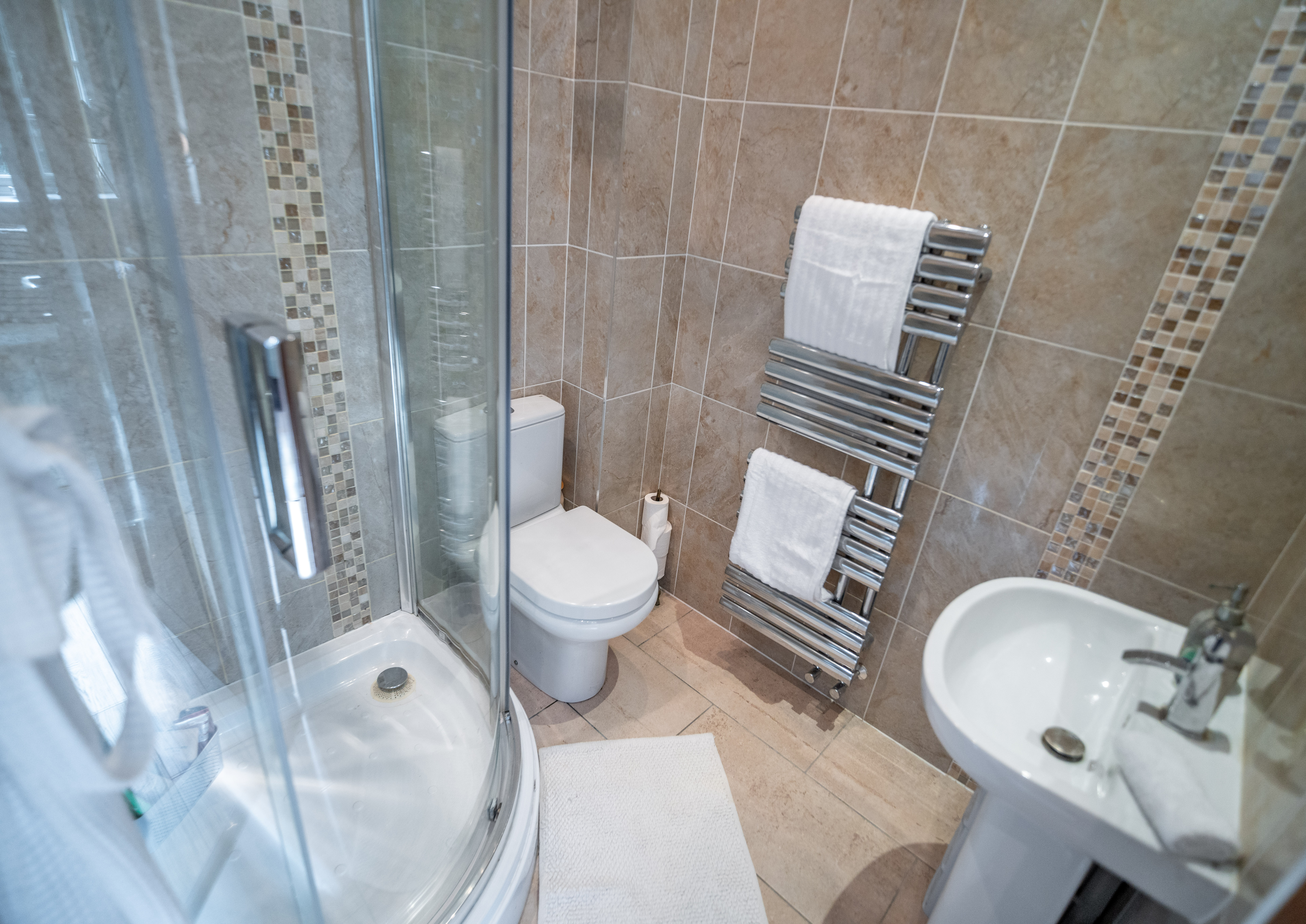This private en suite shower room comprising walk-in shower, vanity basin, WC, heated towel rail, and fully tiled walls.