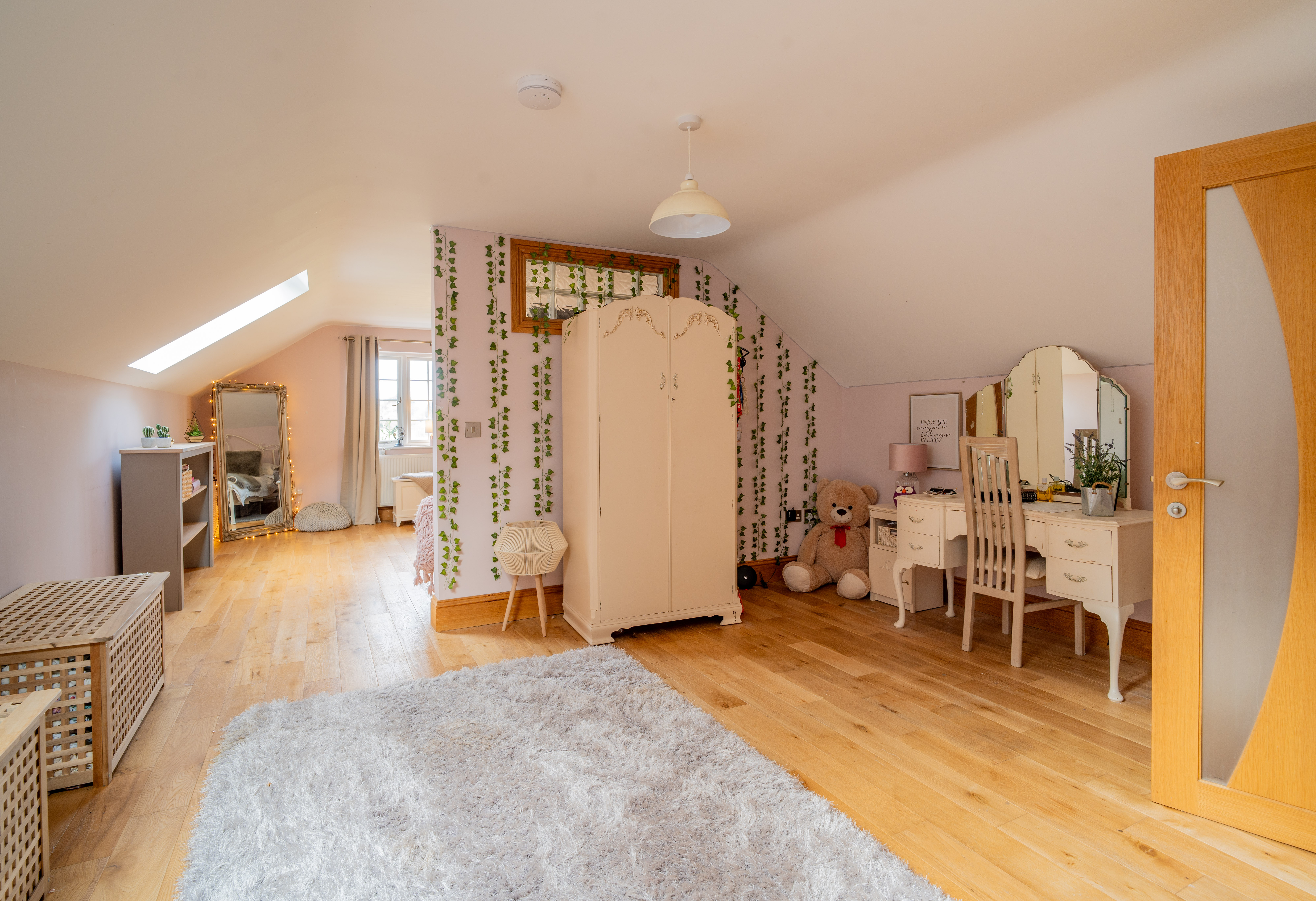 A luxurious front-aspect suite with engineered oak flooring, coved ceiling, and double-glazed windows offering countryside views.