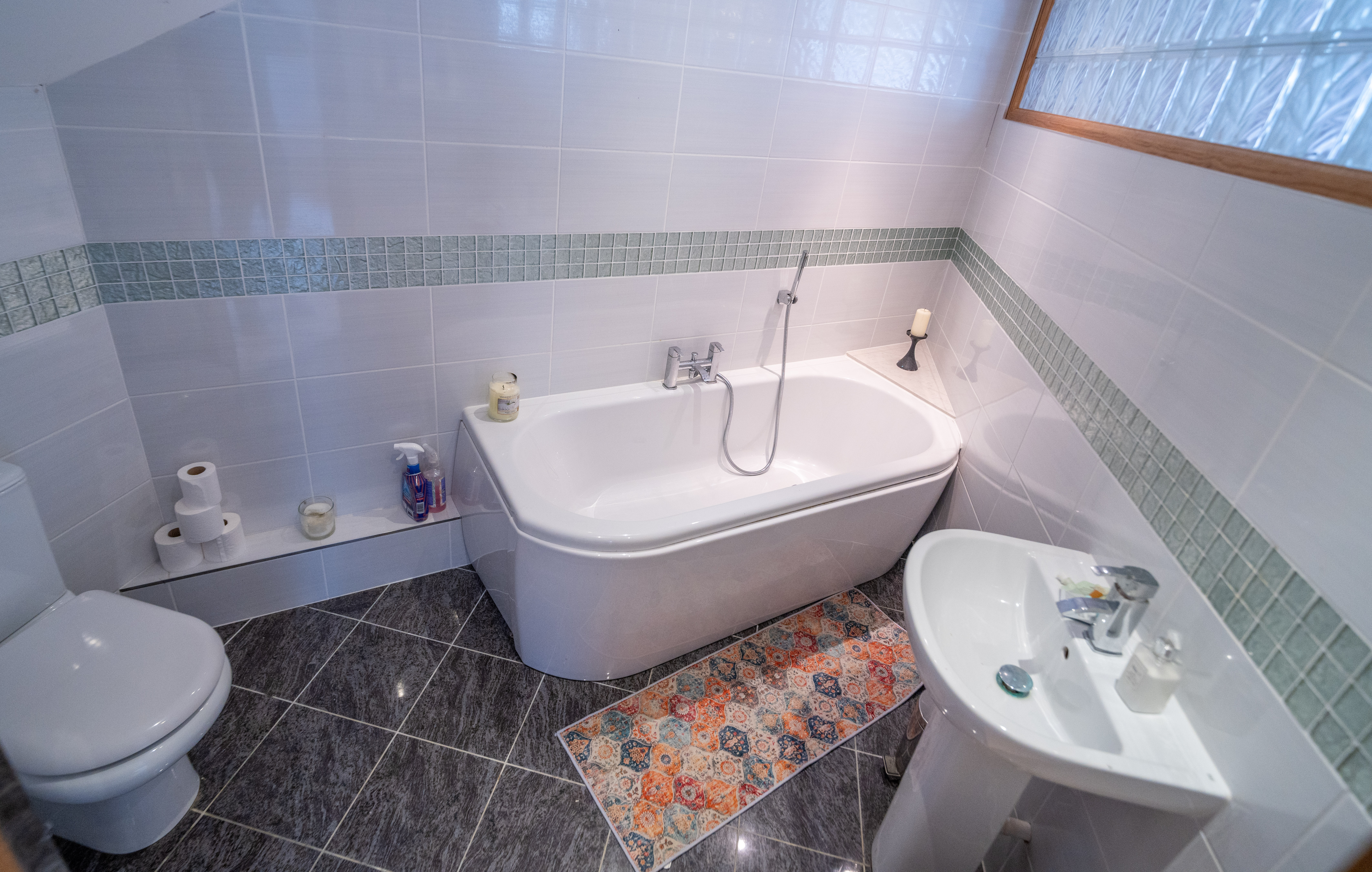 The en suite bathroom includes a panelled bath, pedestal basin, WC, heated towel rail, and tiled finishes with obscured glass-brick feature wall.