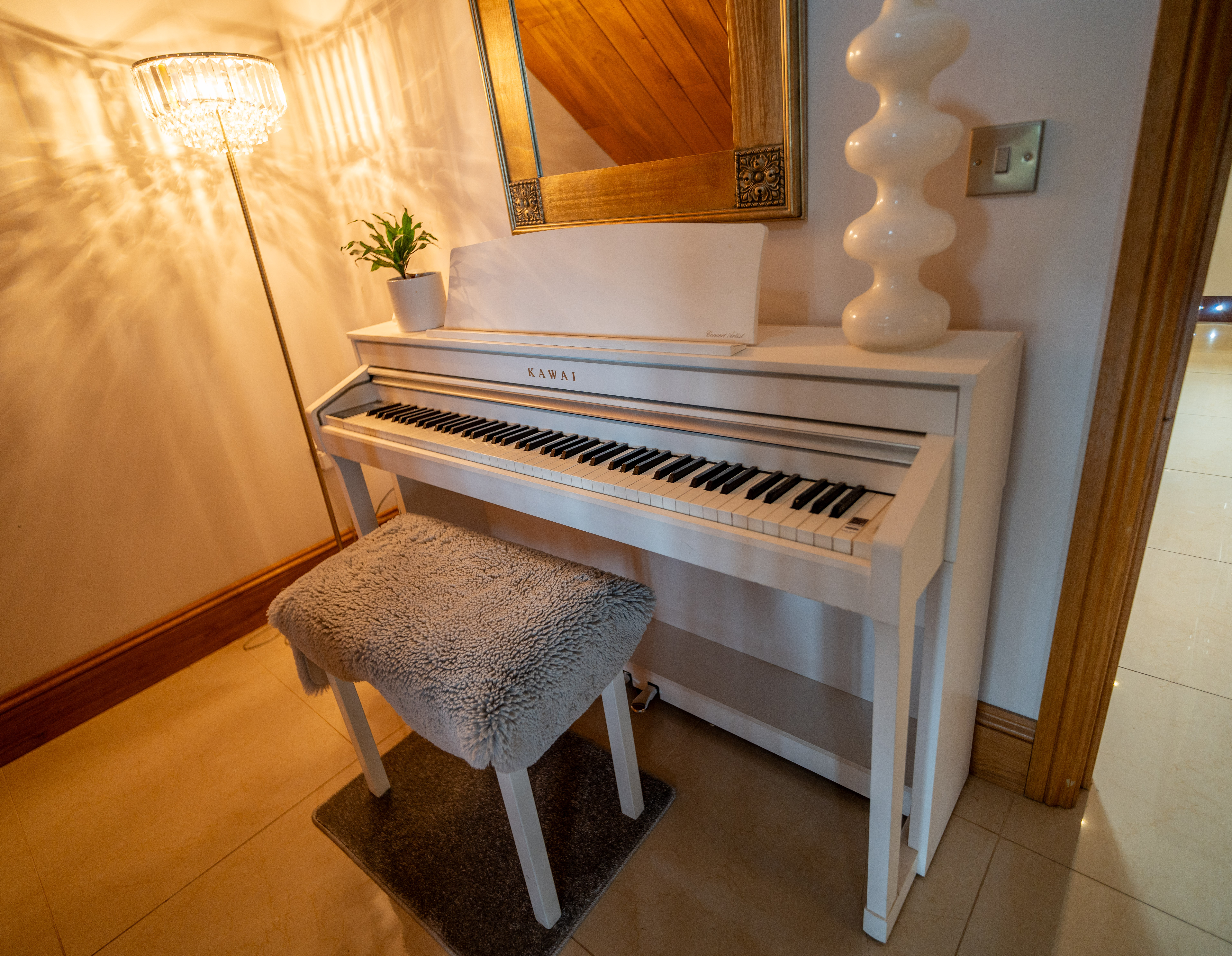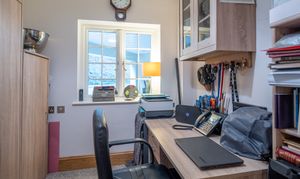 Accessed via an inner lobby, the study enjoys a side aspect, double-glazed window, ceramic tiled floor, fitted furniture, and a coved ceiling — ideal for home working or quiet reading.