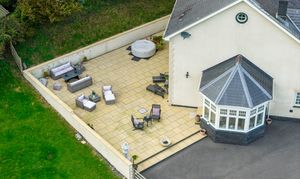 To the left of the house, an extensive stone patio terrace offers an exceptional outdoor entertaining area, connecting directly with the conservatory and side covered walkway. Beyond lie the paddocks and landscaped gardens, all enjoying a peaceful and private rural outlook. An additional adjoining plot of approximately six acres is also available by separate negotiation, offering potential for further development or equestrian use (subject to consents).