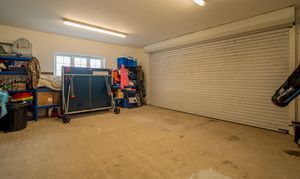 An attached double garage provides secure parking for two large vehicles, with an electric up-and-over door and additional storage space. A covered side passage links the garage to the house, offering convenient sheltered access.