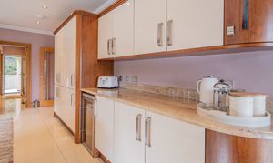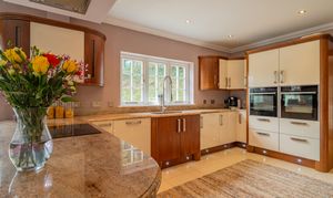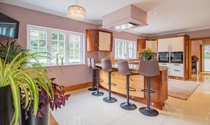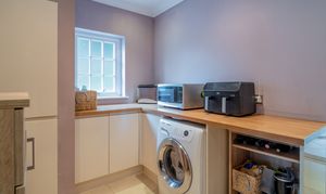 The magnificent kitchen and breakfast room forms the heart of the home. Fitted with bespoke cabinetry in a combination of warm wood and high-gloss lacquer finishes, complemented by quartz work surfaces, the kitchen is both elegant and practical. Featuring a substantial breakfast bar incorporating a Neff halogen hob with feature extractor. Appliances include two built-in Neff double ovens, full-height integrated fridge and freezer, Bosch dishwasher, plus a pantry cupboard and provision for a wine cooler. Large double-glazed windows, recessed lighting, and porcelain tiled flooring ensure a bright, contemporary feel with direct access to the conservatory and utility room.