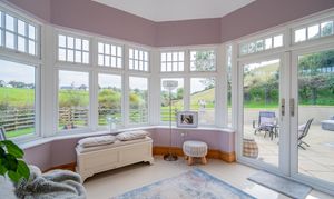 A triple-aspect conservatory with UPVC double-glazed windows overlooking the paddock and gardens, finished with polished porcelain tiles. French doors open directly to the stone patio terrace, seamlessly blending indoor and outdoor living.