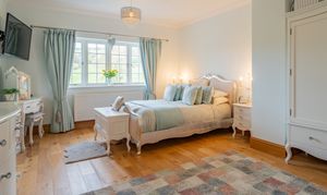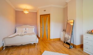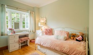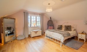 This rear-aspect bedroom enjoy peaceful views over the gardens and paddocks, featuring engineered oak flooring, coved ceilings, and radiators — perfect for family or guest accommodation.