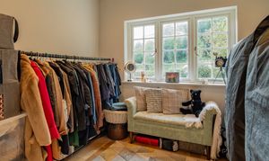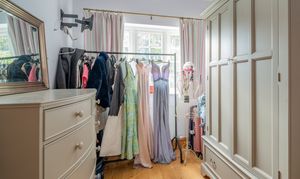 The adjoining dressing room overlooks the rear garden and features high ceilings and ample space for fitted storage.