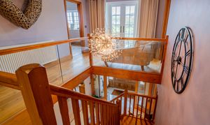 An oak staircase with glass balustrade rises to a spacious landing with engineered oak flooring, recessed lighting, and double French doors opening onto a balcony overlooking the front gardens and countryside.