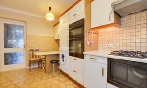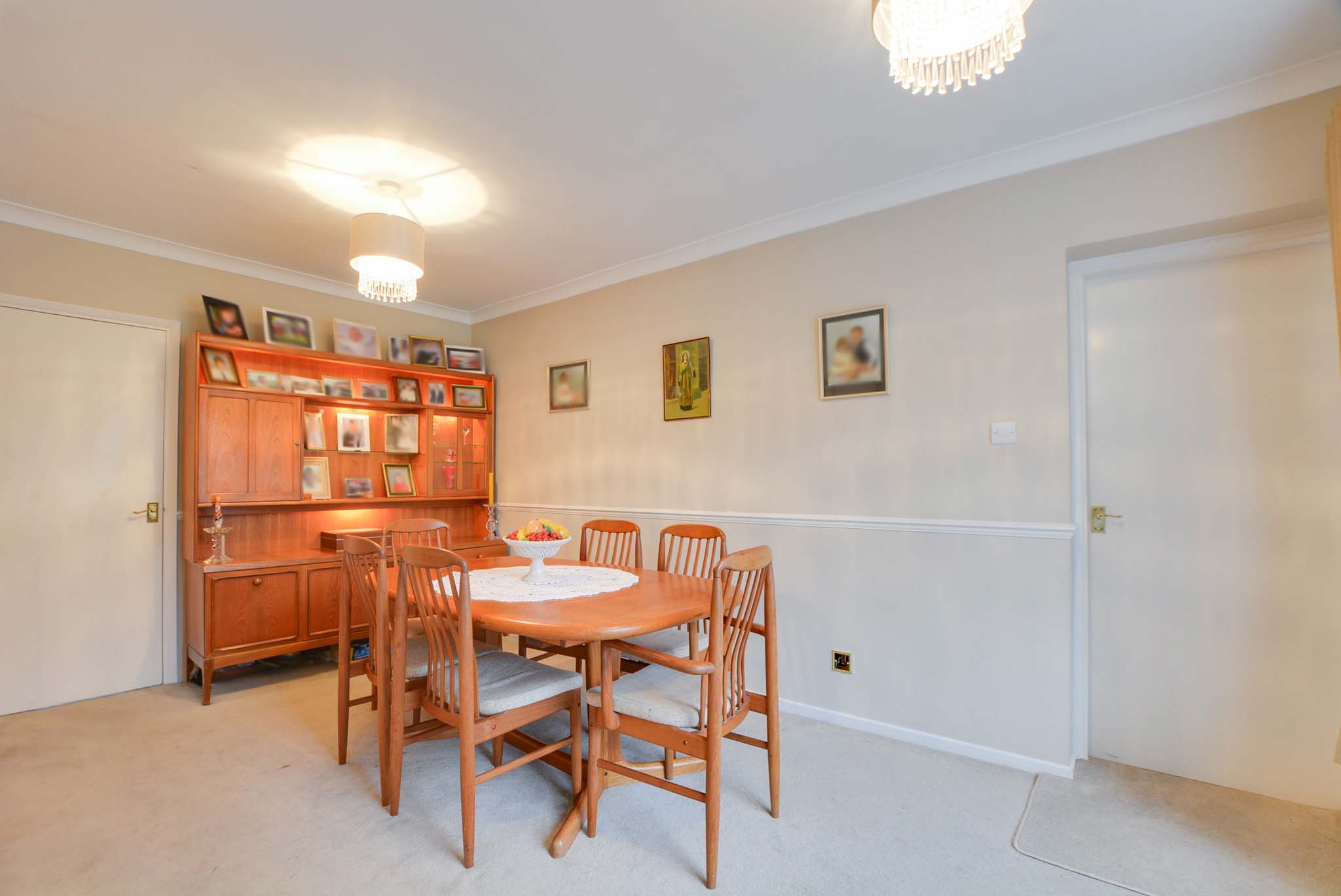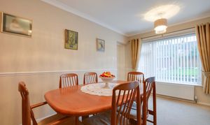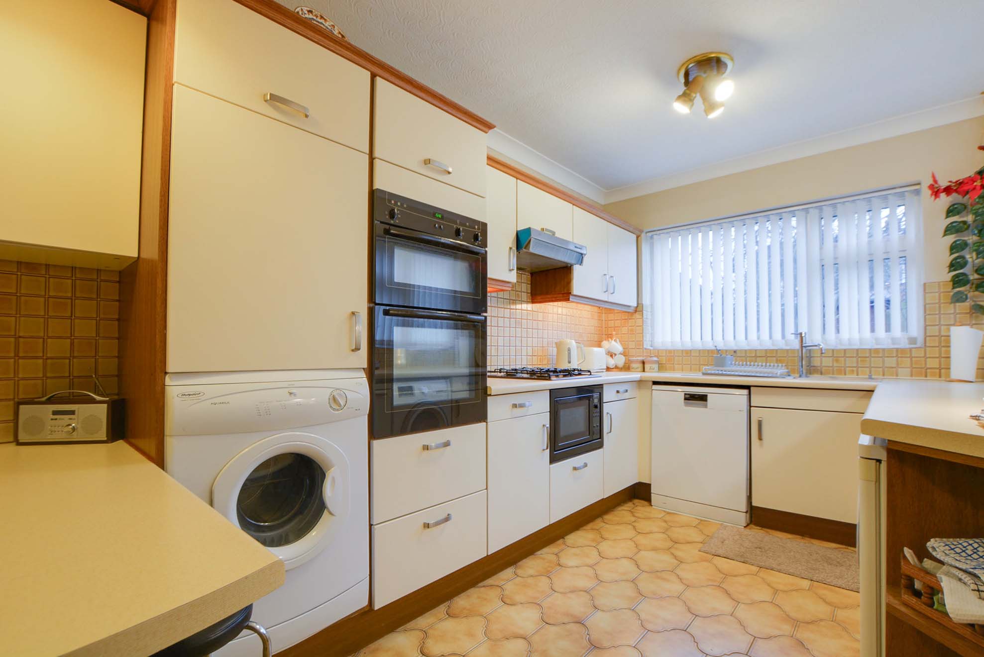 The dining kitchen is fitted with a range of base and wall units with roll-edge work surfaces, stainless steel sink and drainer, integrated four-ring gas hob, double oven and microwave. There is plumbing for a washing machine and dishwasher, space for a fridge and a built-in breakfast bar seating four. Windows to the side and rear provide natural light. A rear lobby offers access to the garden, driveway and garage.