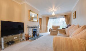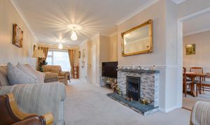 (narrowing to 2.6m) Featuring a double-glazed window to the front, double-glazed sliding patio doors to the rear garden, a chimney breast with a living flame gas fire with stone surround and hearth, coving to the ceiling, dado rail, television point, an archway to the dining room and two radiators.