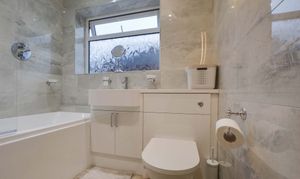 Featuring an obscured double-glazed window to the side elevation, bath with shower over, low-level WC, wash hand basin with under-basin storage, and fully tiled walls.