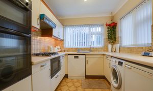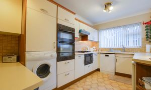 Featuring double-glazed windows to the side and rear, ceramic tiled flooring, base and wall units with roll-edge laminated work surfaces, a stainless steel sink/drainer, Integrated appliances include: a four-ring gas hob, double oven, and microwave, plumbing for a washing machine, plumbing for a dishwasher, space for a fridge, a built-in breakfast bar (seats four), coving to the ceiling, and a radiator.
