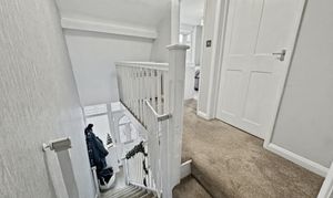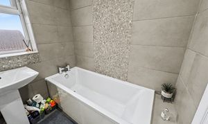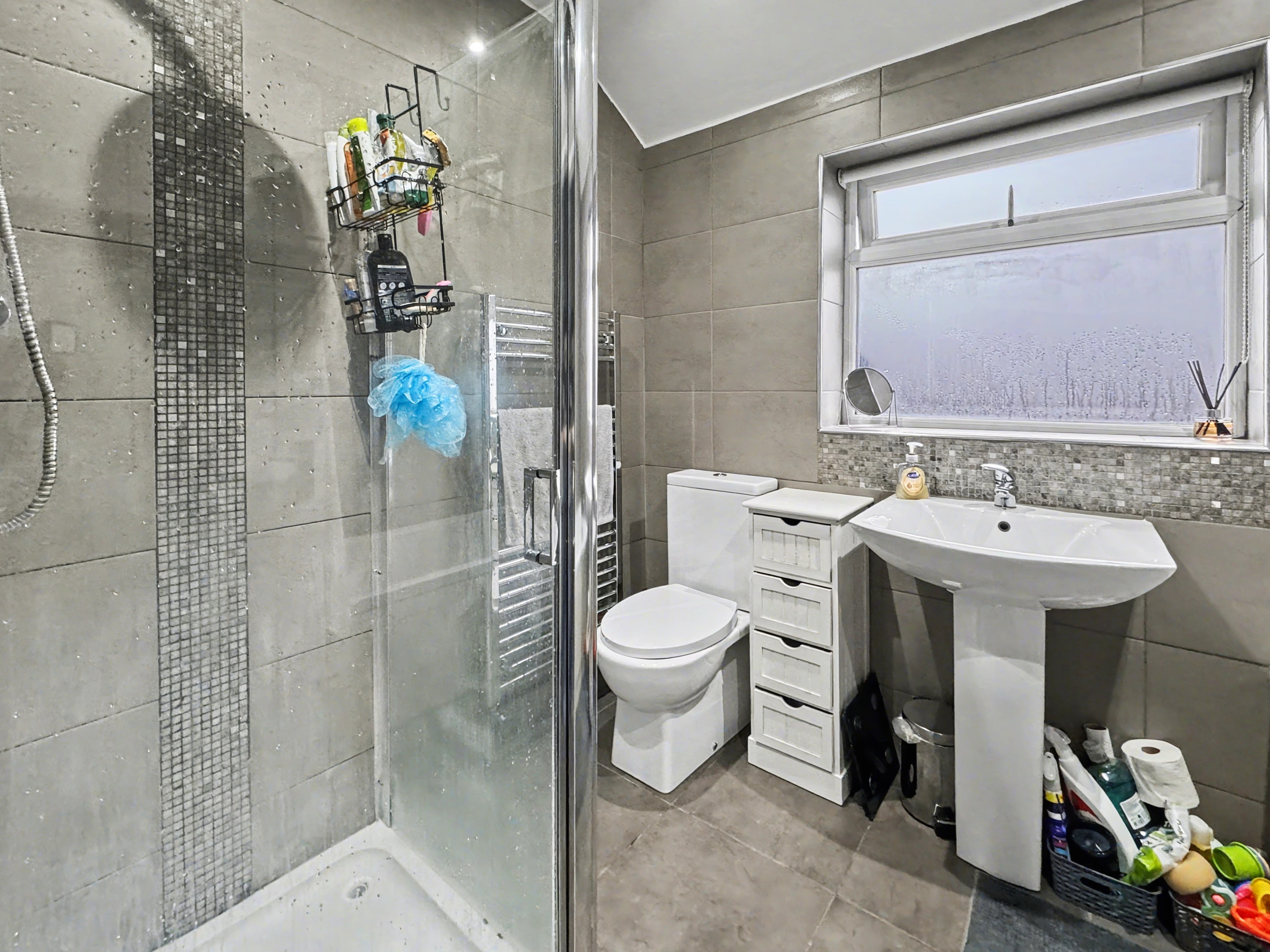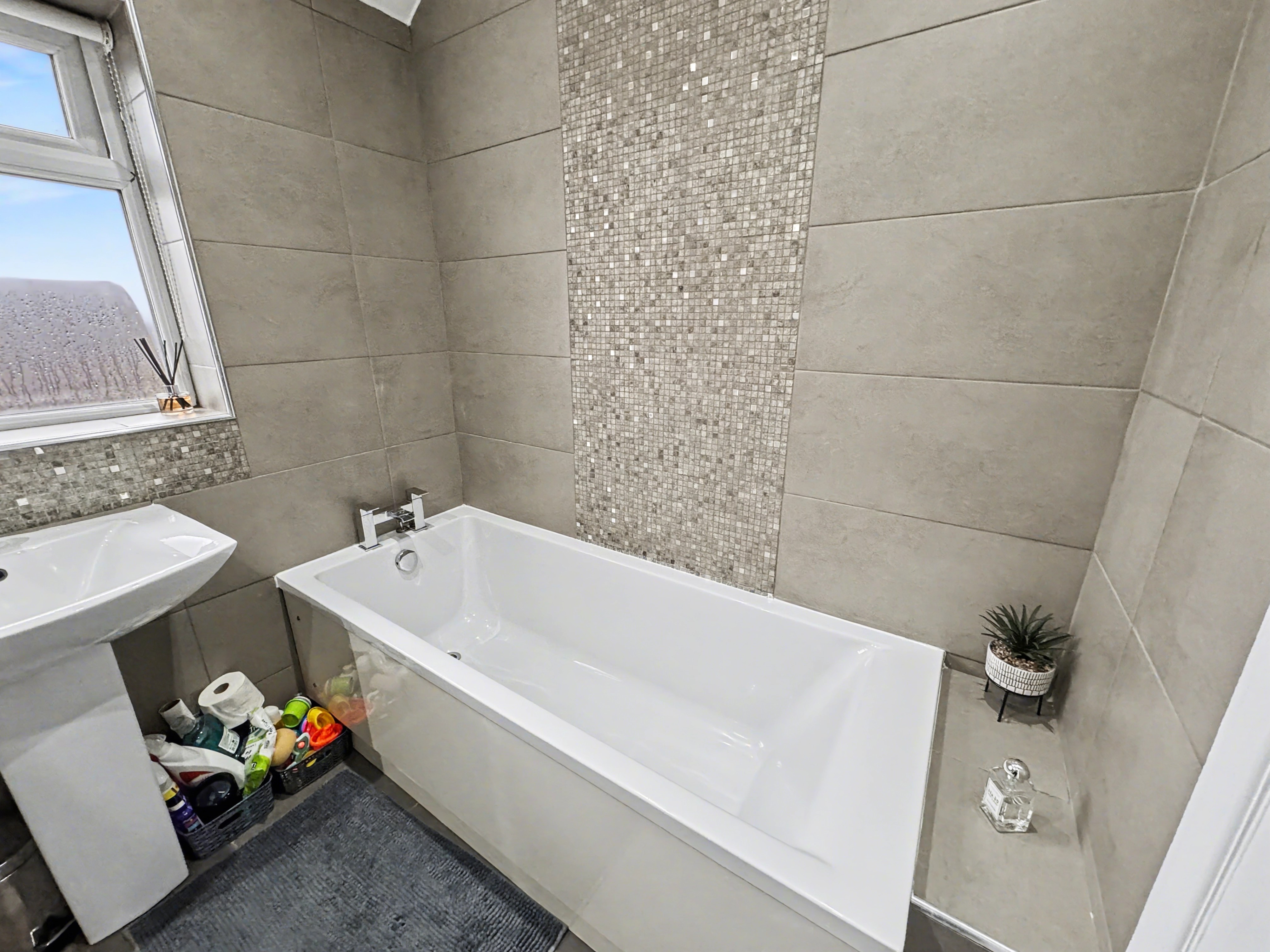 Upstairs, the property boasts two well-proportioned double bedrooms, both finished to a high standard. The stylish bathroom is particularly spacious, fitted with a large bath and a separate walk-in shower, adding a touch of luxury to this immaculate home.