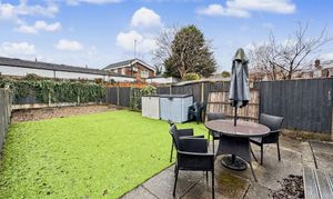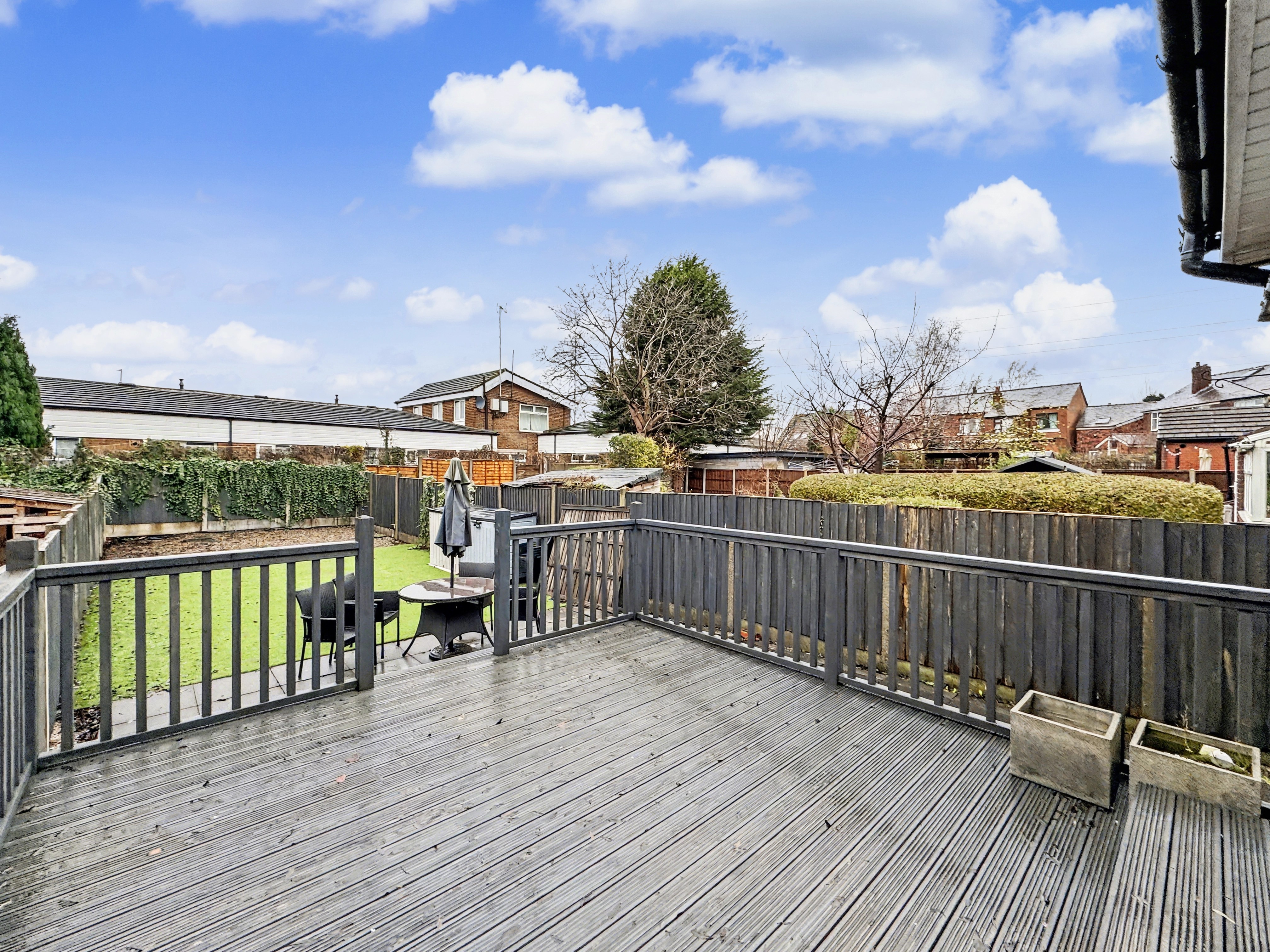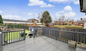 French doors open out onto the generous south-facing garden, featuring a substantial raised decking area for outdoor dining and a large lawn beyond, offering plenty of space to enjoy throughout the year.