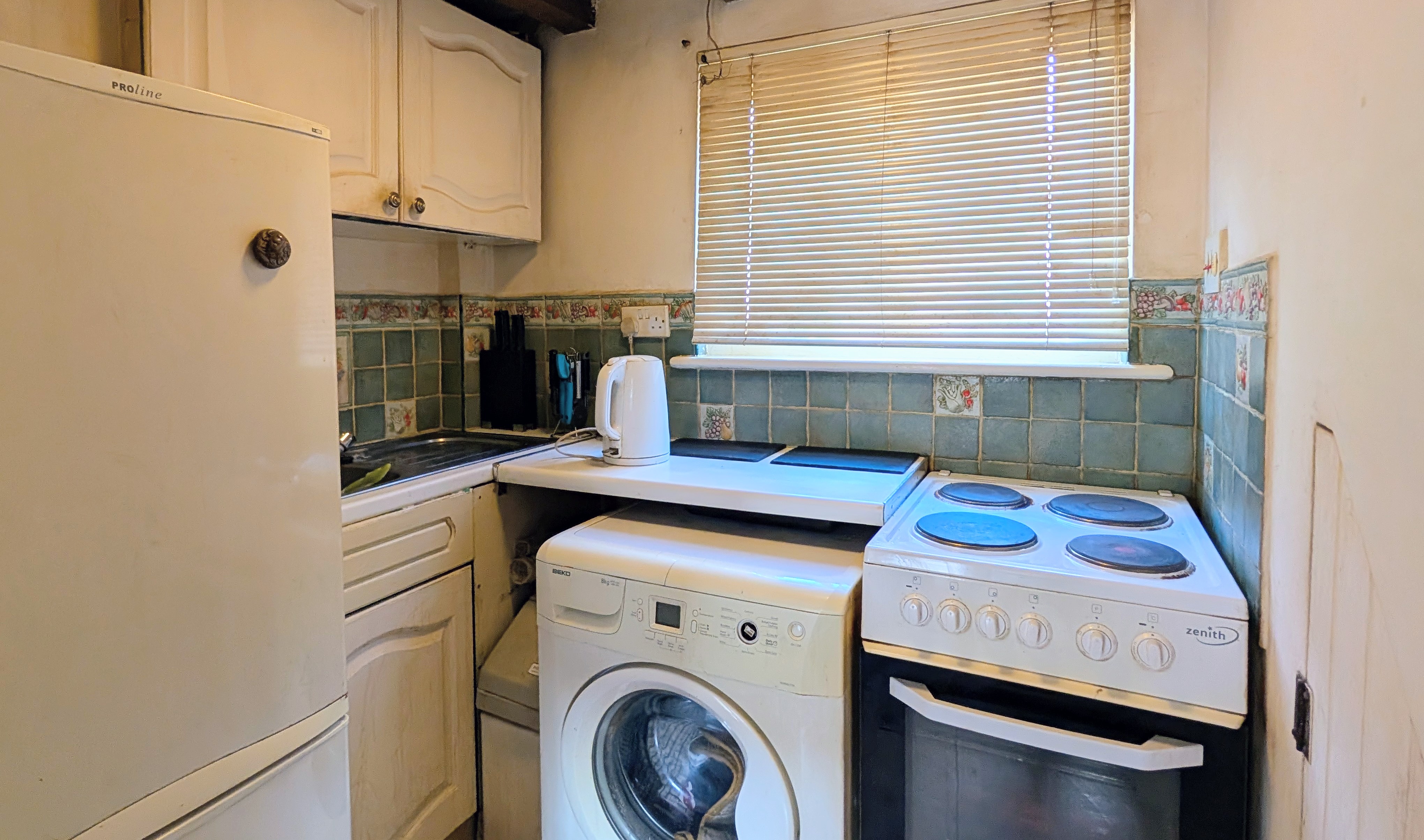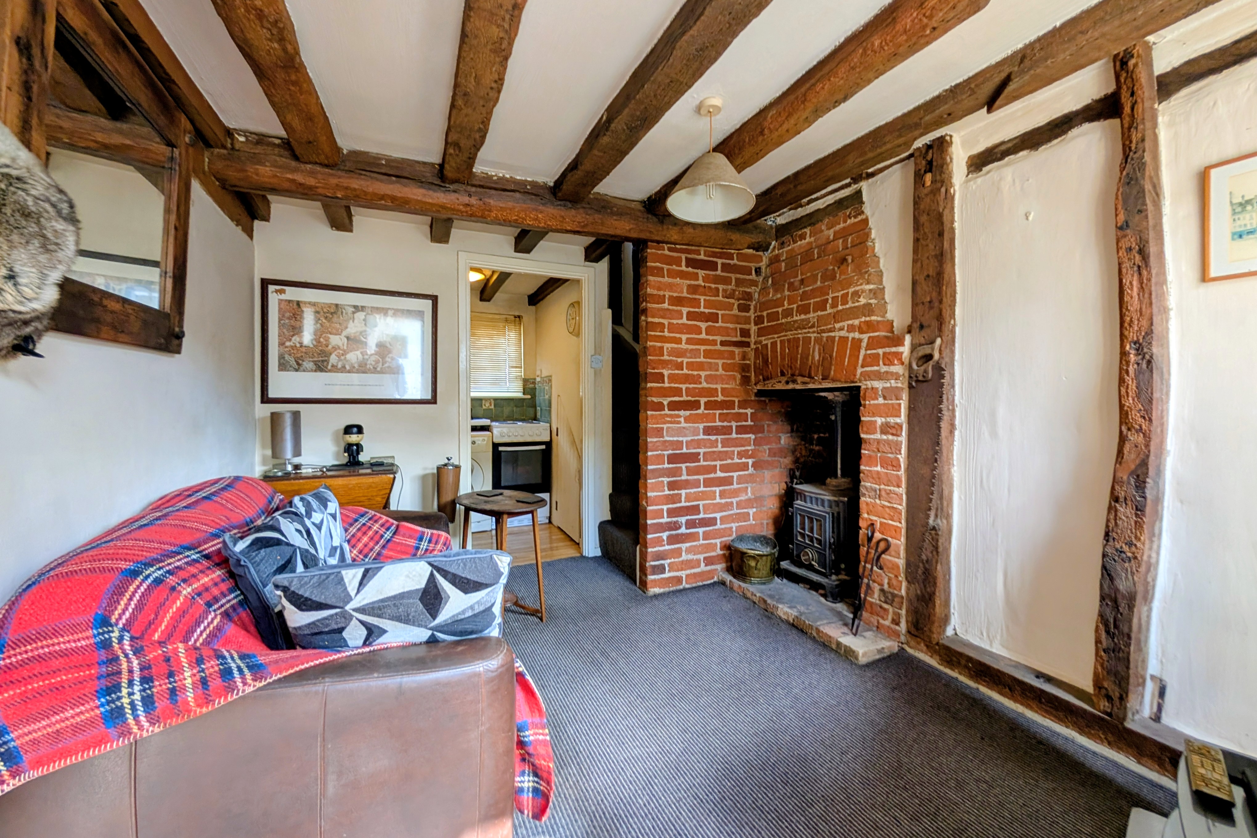 Set in a peaceful, tucked away spot in the heart of the village, this one bedroom house is full of character and offers plenty of potential for first-time buyers or investors. The living room features exposed beams, a brick fireplace with log burner and stairs to the first floor, with a compact kitchen beyond and a handy entrance porch with storage.