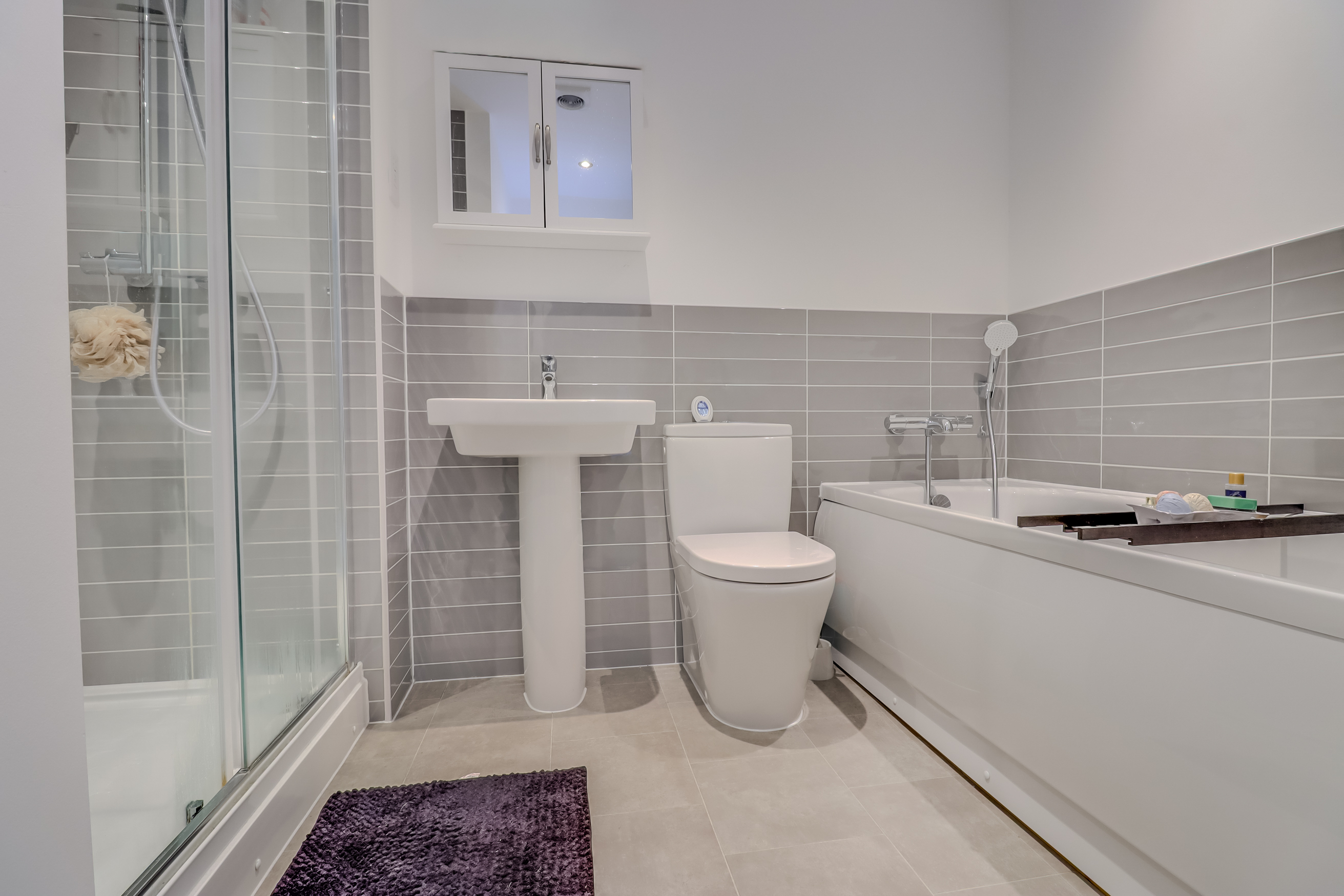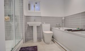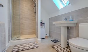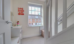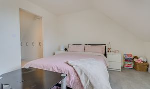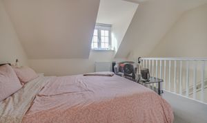 To the first floor there is a landing with doors off to two very generous double bedrooms and a family bathroom with four piece suite comprising panelled bath, separate shower, low flush WC and a pedestal wash hand basin. A separate landing area has a staircase (with space under for a dressing table or desk) leads to the stunning master bedroom suite which takes up the entirety of the first floor with fitted wardrobes in a dressing area and an en-suite shower room.