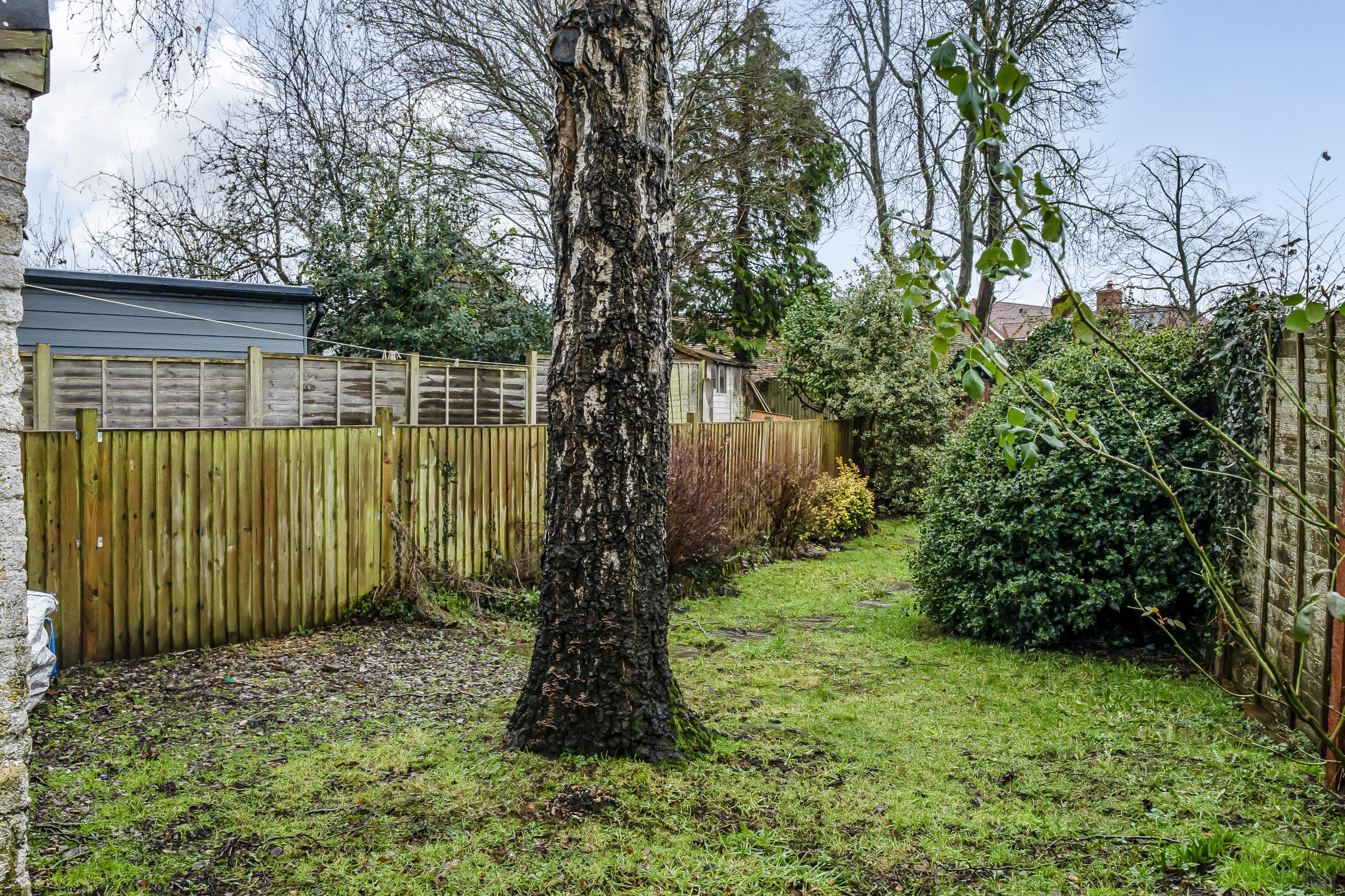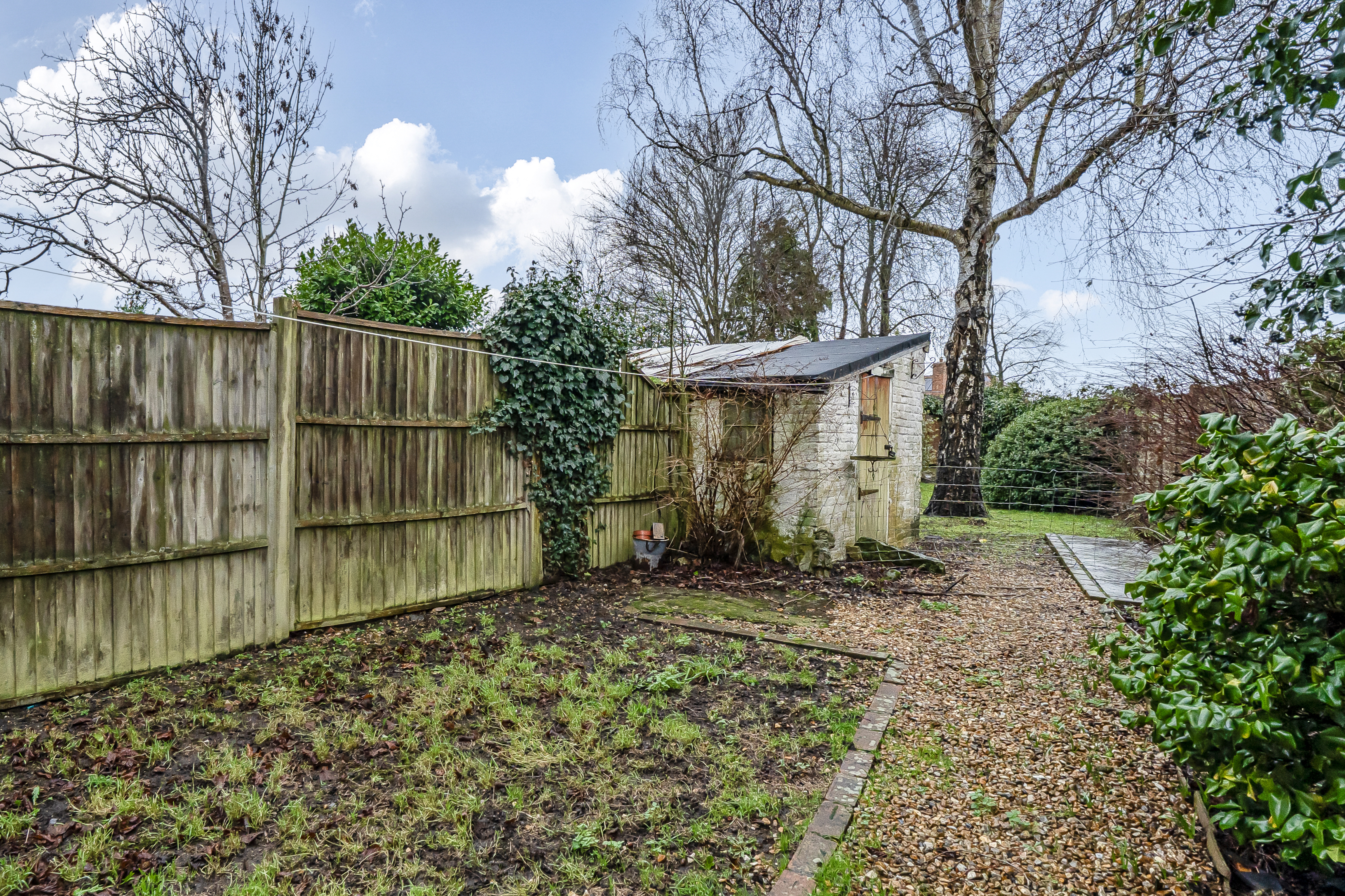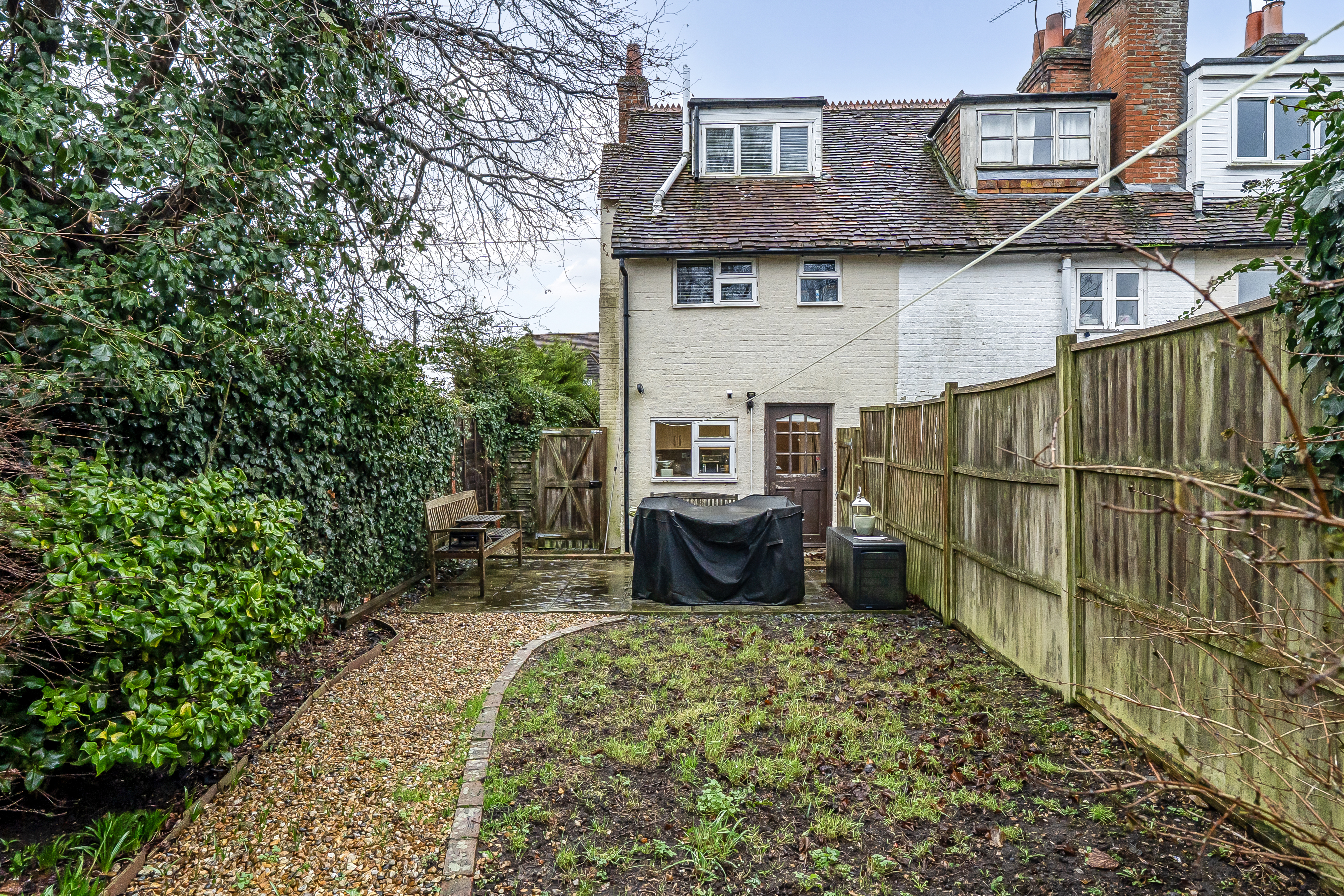 To the front of the property is an enclosed garden with mature planting and a pathway to the front door.