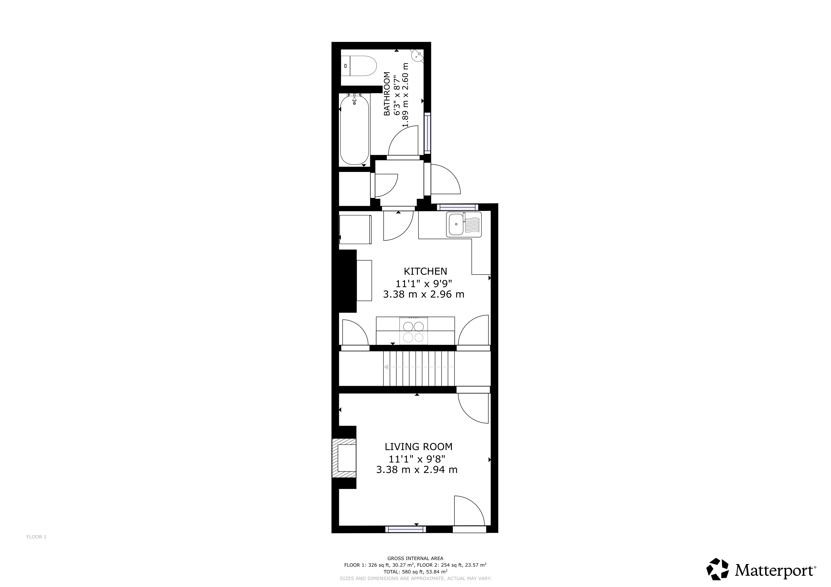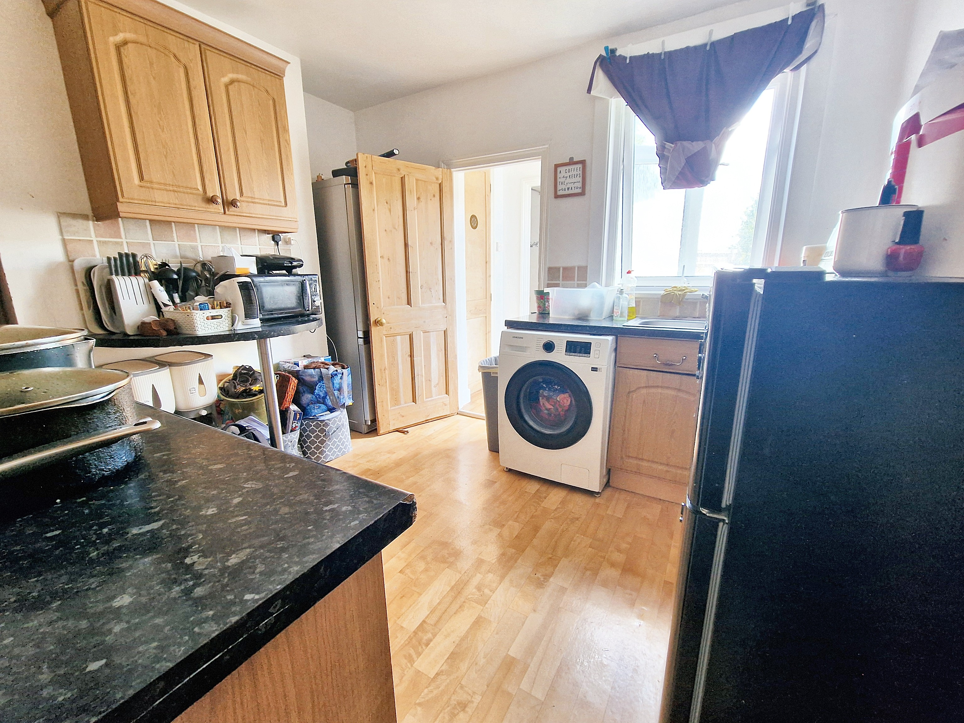 Kitchen: with wall and floor-mounted kitchen units with fitted electric oven, hob and extractor hood, sink, under-counter space and plumbing for washing machine, tiled splashbacks 2.80m x 3.36m at max
