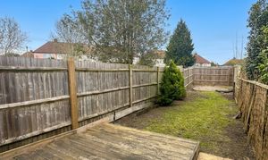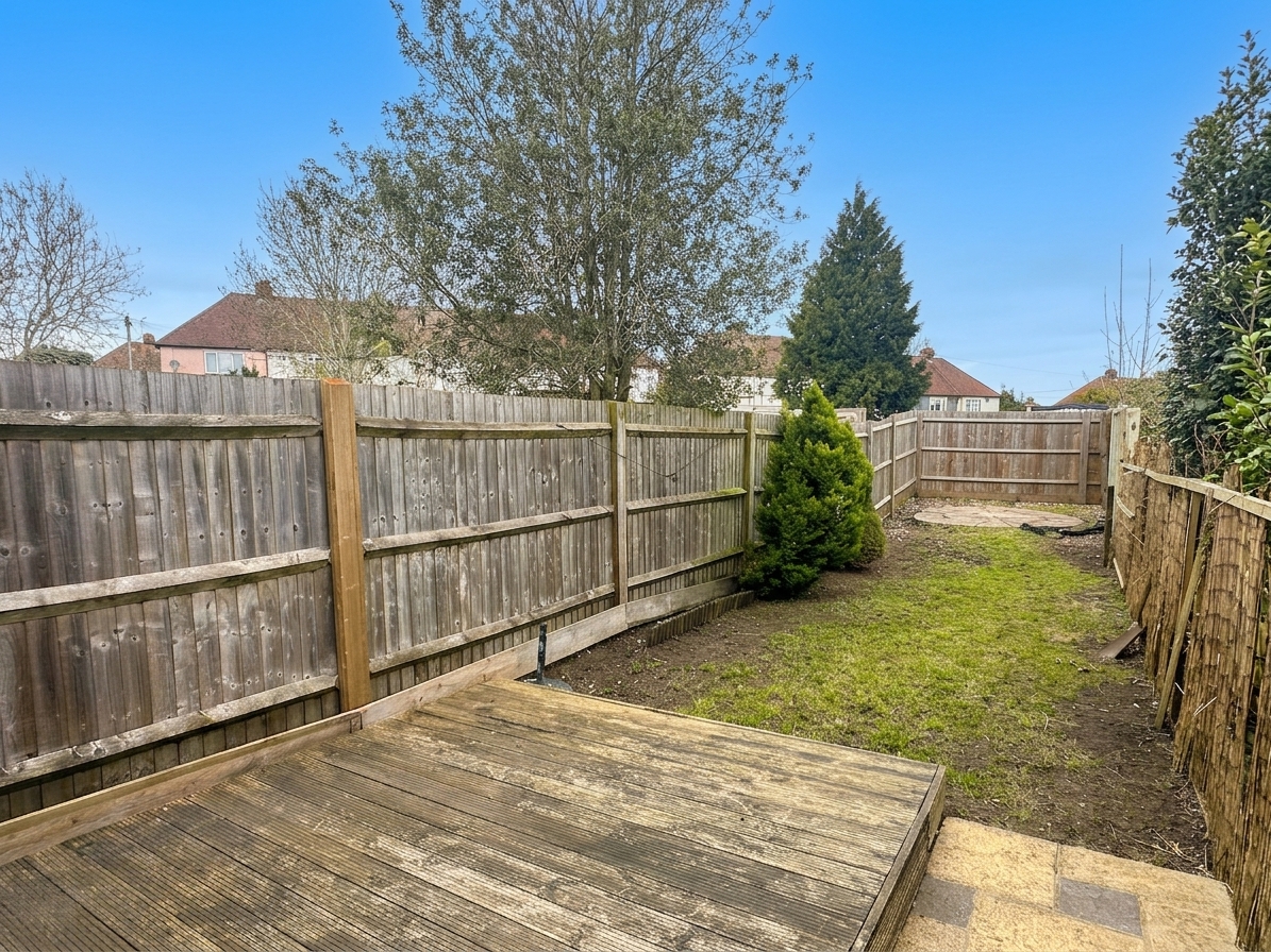 Rear garden with section laid to lawn and area of decking, small brick shed and lean-to