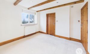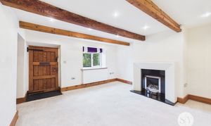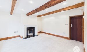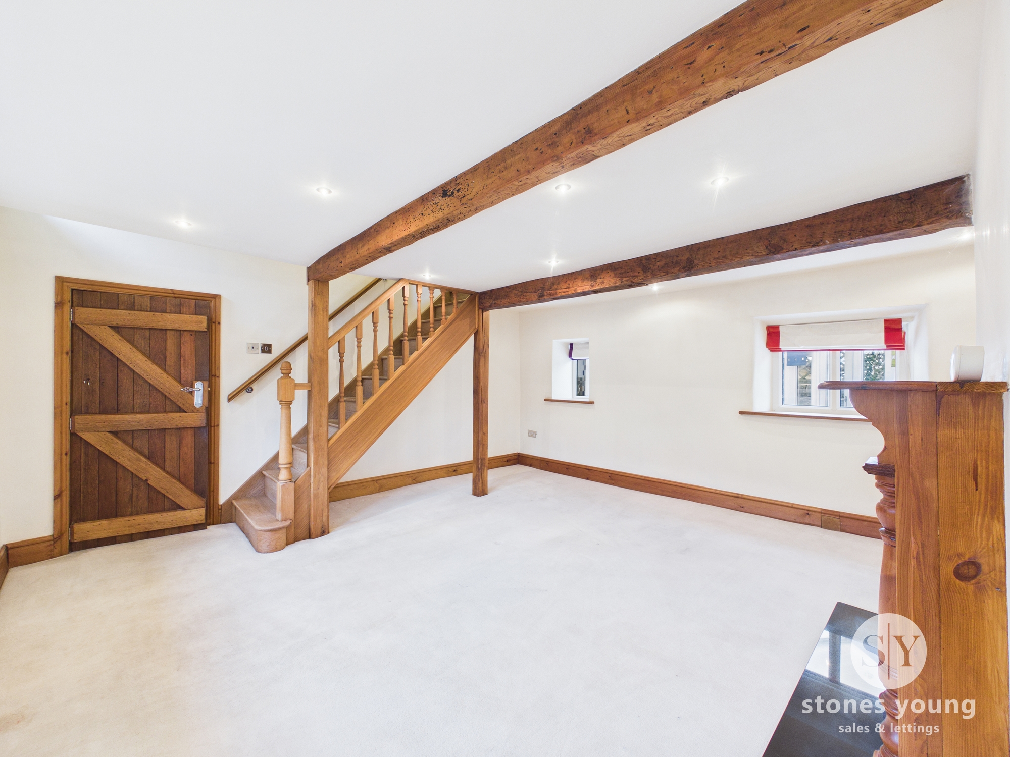 Carpet flooring, wood beams, ceiling spot lights, gas fire, wooden front door, double glazed uPVC window, storage cupboard, panel radiator.