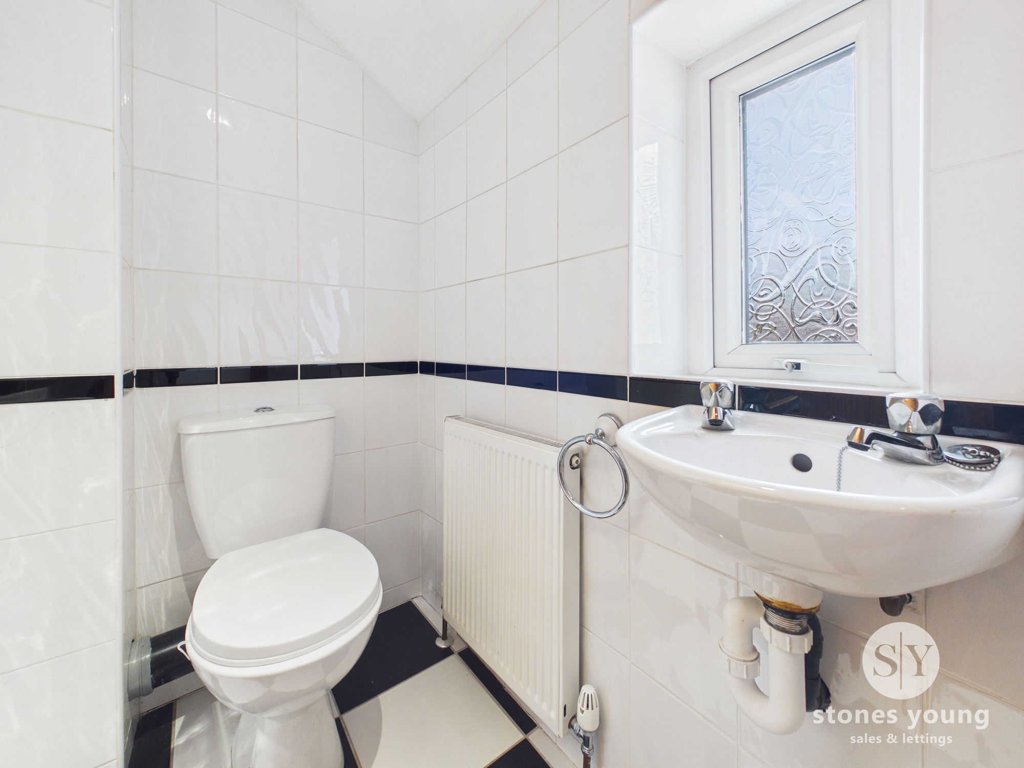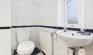 Tiled flooring, wc and basin in white, tiled floor to ceiling, ceiling spot lights, frosted double glazed uPVC window, towel radiator.