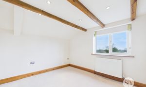 Double bedroom with carpet flooring, wood beams, x5 double glazed uPVC windows, x2 panel radiators.