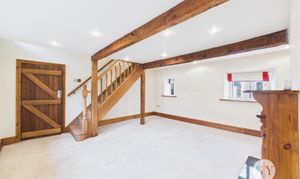 Carpet flooring, stairs leading up to the first floor, gas fire, wood beams, ceiling spot lights, x5 double glazed uPVC windows, panel radiator.