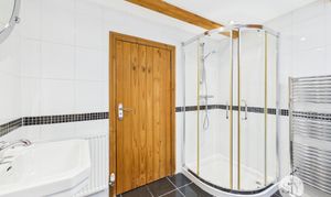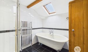 Tiled flooring, three piece in white comprising of mains fed shower enclosure, freestanding bath and basin, tiled floor to ceiling, ceiling spot lights, wood beams, Velux window, storage cupboard, towel radiator and panel radiator.
