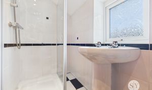 Tiled flooring, three piece in white comprising of mains fed shower enclosure, wc and basin, tiled floor to ceiling, ceiling spot lights, frosted double glazed uPVC window, panel radiator.