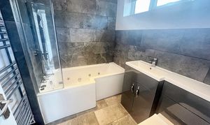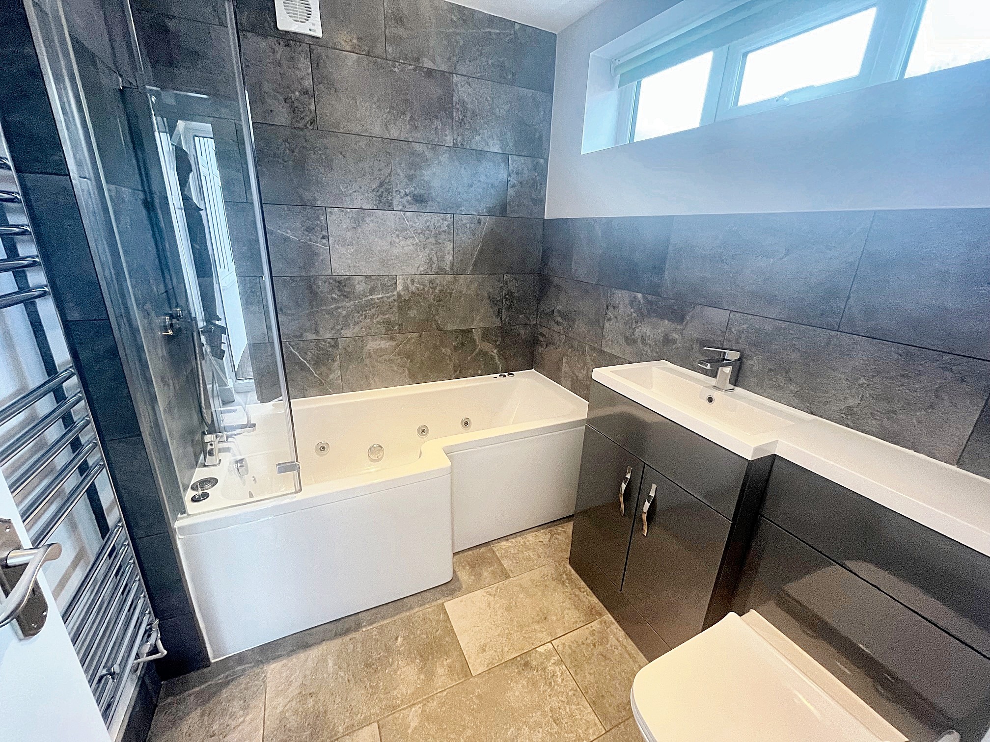 With tiled floor, bath with shower, wash hand basin and WC, heated towel rail and double glazed window