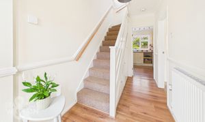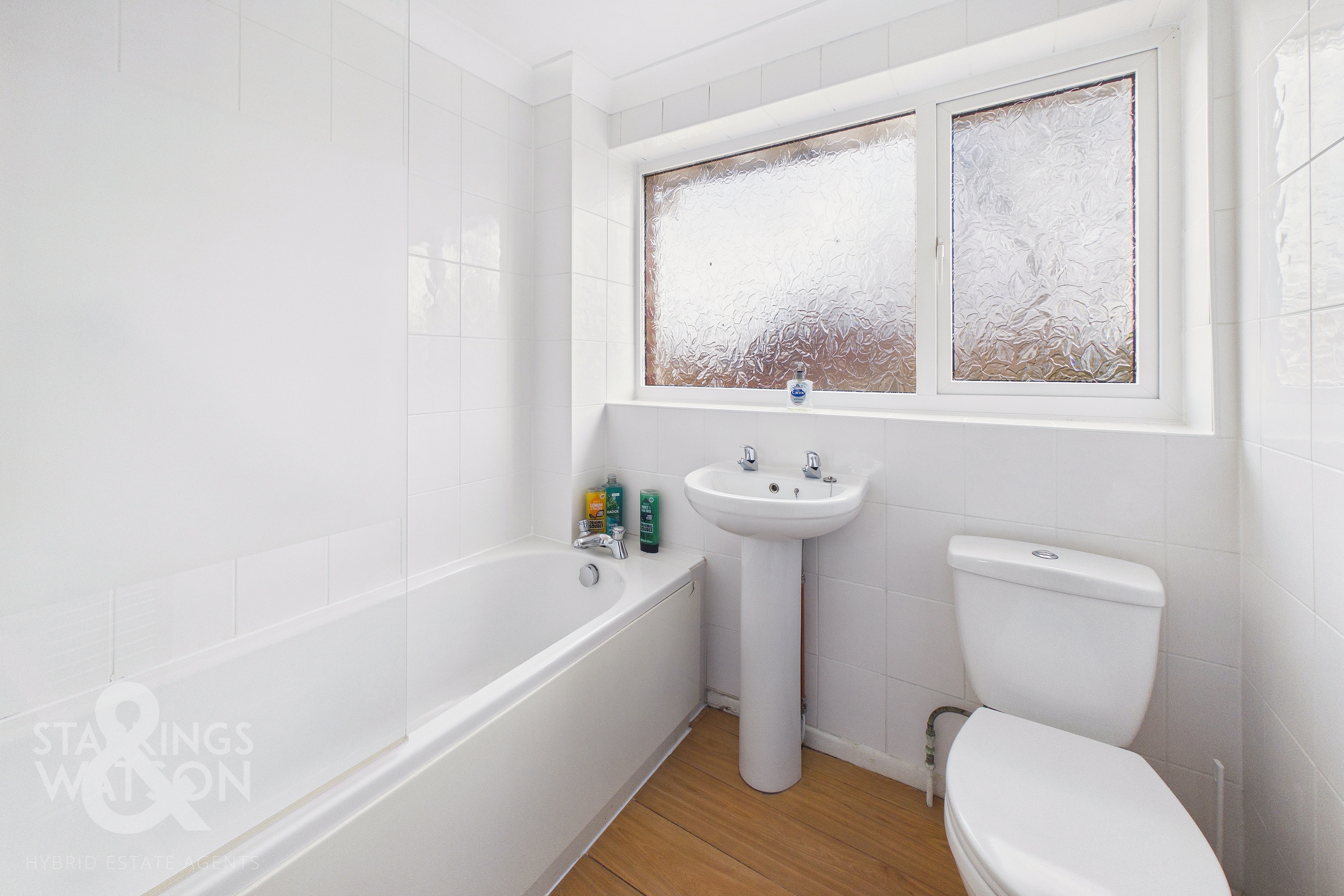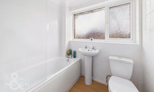 Heading upstairs, the carpeted landing offers a side facing window and loft access hatch, with doors taking you to three bedrooms - all furnished with fitted carpet and uPVC double glazing, with the smallest bedroom including a built-in over stairs storage cupboard. Completing the property is a family bathroom with a white three piece suite including a shower over the bath with glazed shower screen, tiled walls, heated towel rail and wood effect flooring.