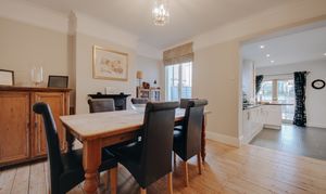 The entrance hallway immediately sets the tone, offering a sense of scale and flow that carries throughout. To the left, the formal living room (13’6” x 11’6”) is calm and inviting, washed in natural light from the bay window. Original cornicing and a striking fireplace sit comfortably alongside a soft, neutral palette, creating a refined yet welcoming space, ideal for quiet evenings or relaxed entertaining. To the rear, the home opens into a truly impressive open plan kitchen and dining space, the social heart of the house. Bespoke cabinetry, integrated appliances and a five point hob with matching extractor deliver both form and function, while carefully placed pendant lighting defines the dining area, adding warmth and intimacy. It is a space designed for everyday life, elevated.