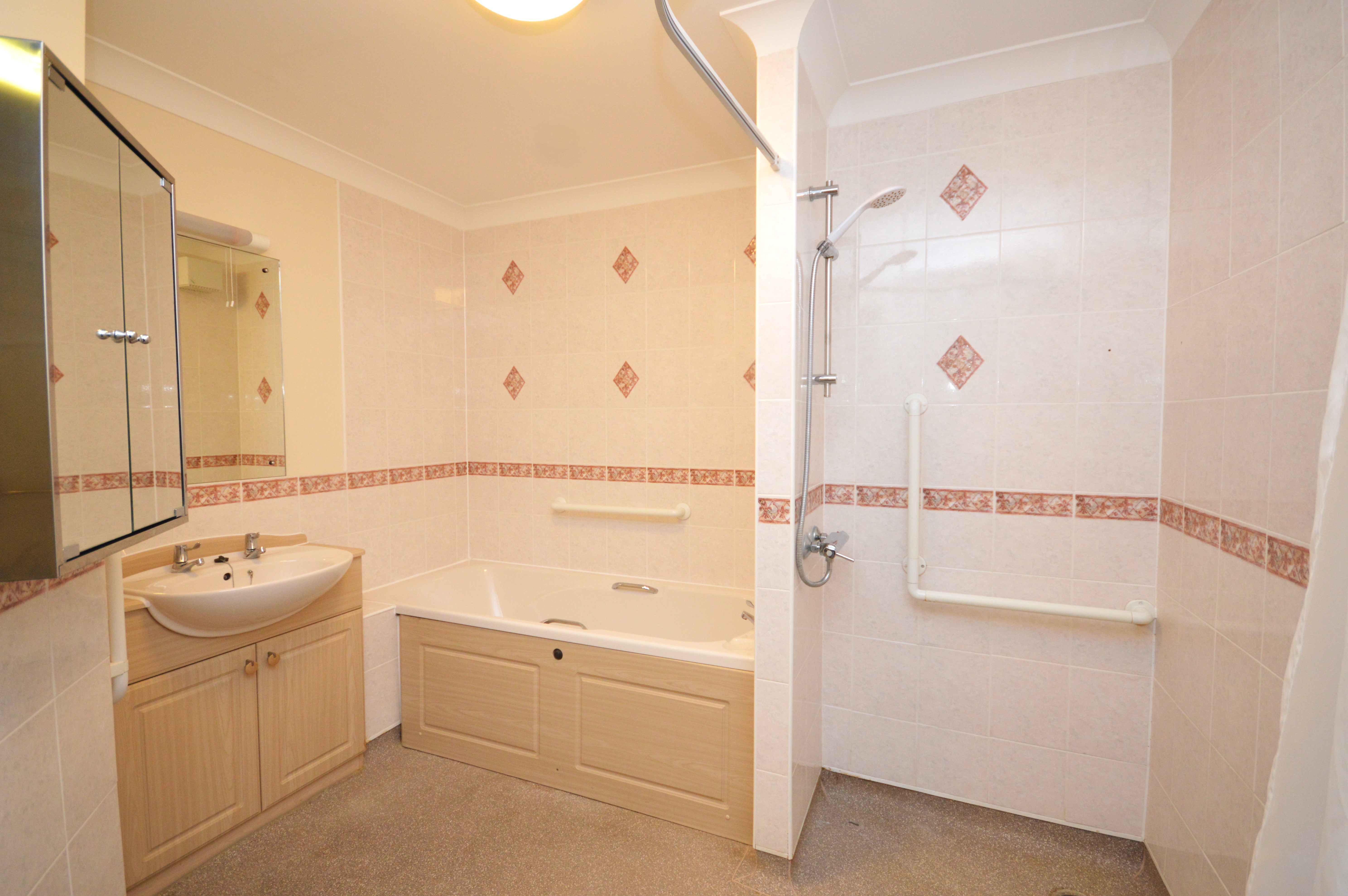 Internal Bath/wetroom with full size bath. Wet room style shower, closed couple WC, part tiled walls, non slip flooring, electric wall mounted Creda heater and coving.