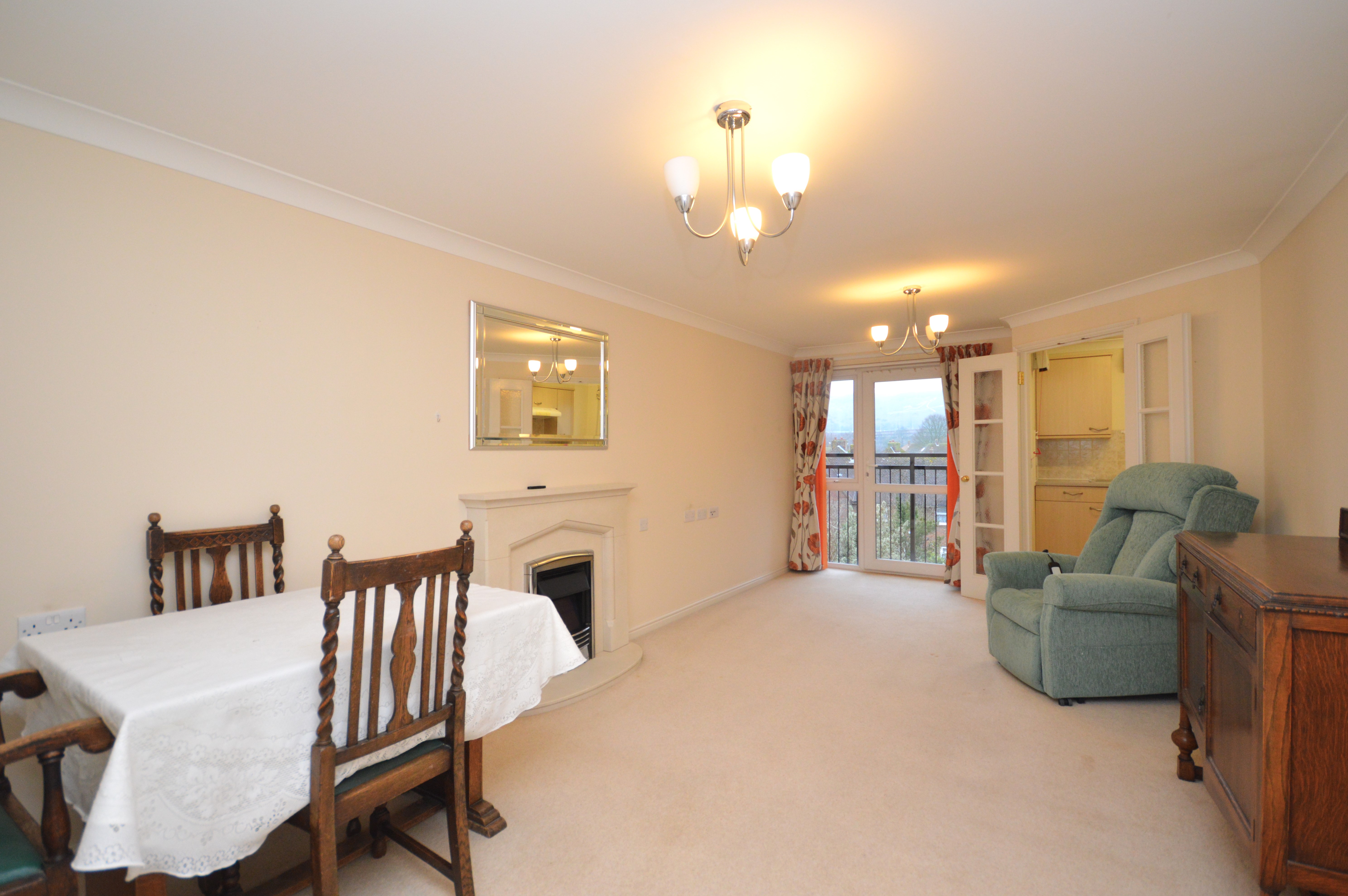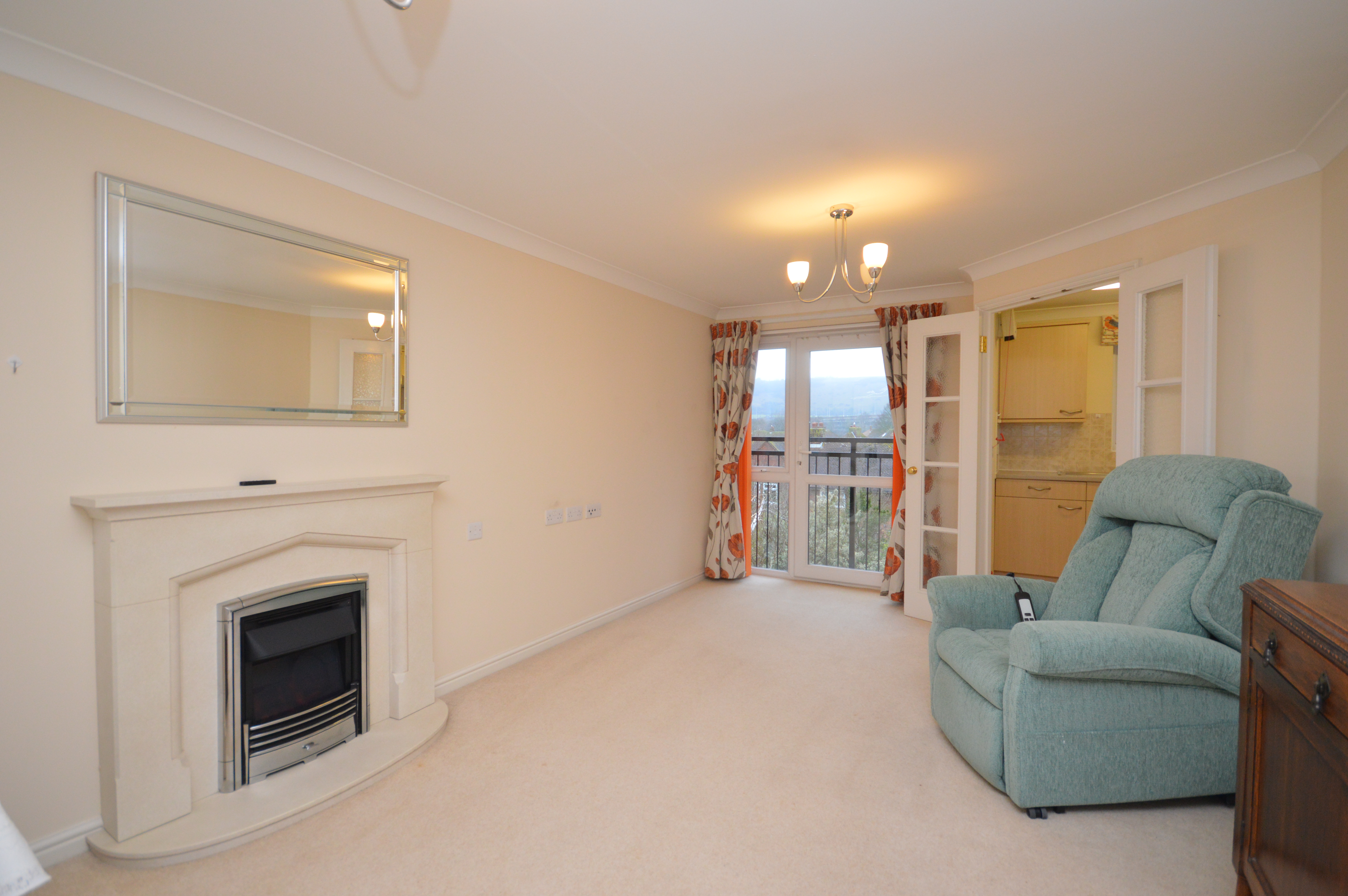 UPVC double glazed Juliet balcony door to rear of the property. Carpeted floor coverings, feature electric fireplace with mirror above fire. Electric night storage heater. Double Doors To :-