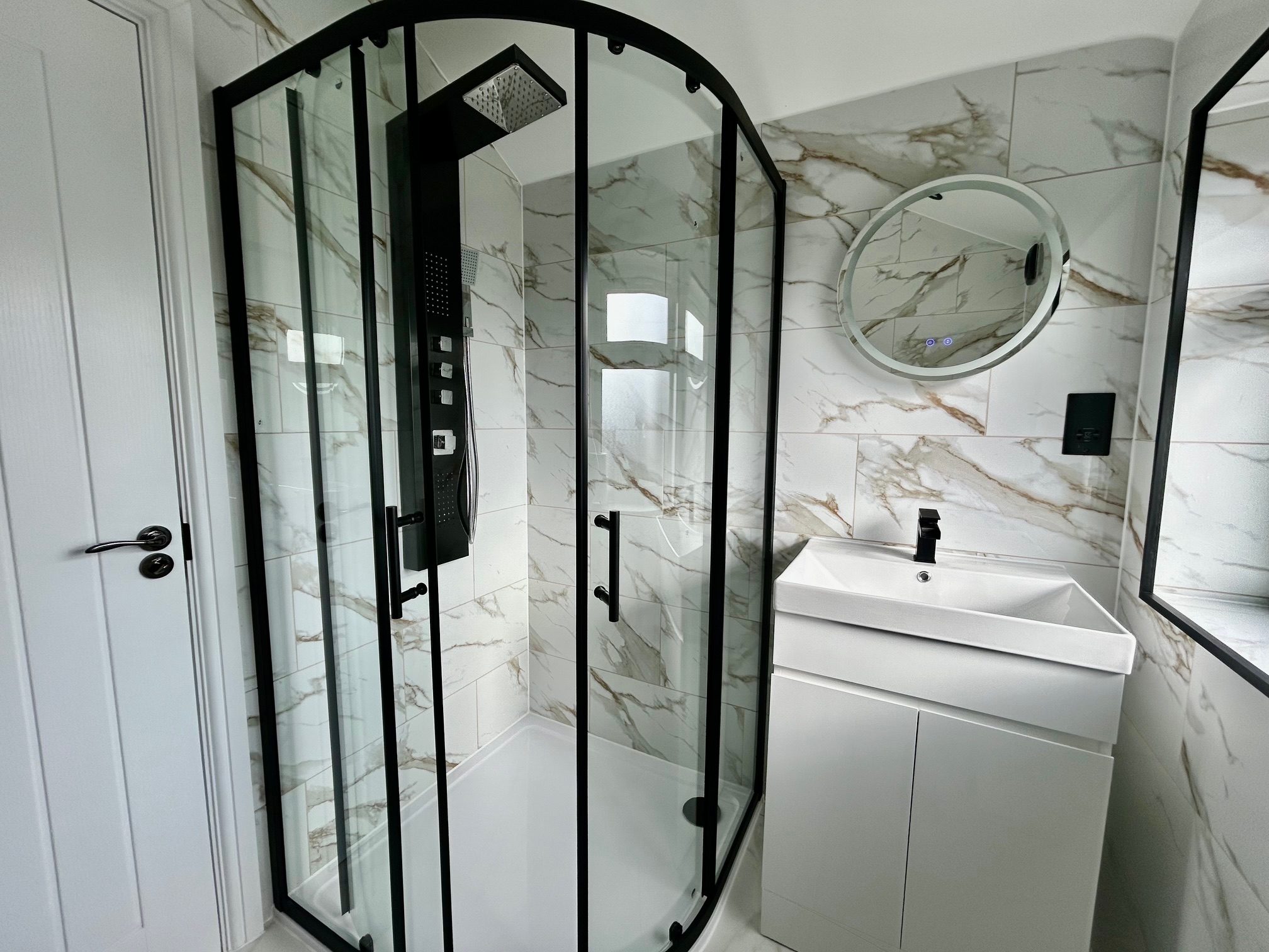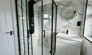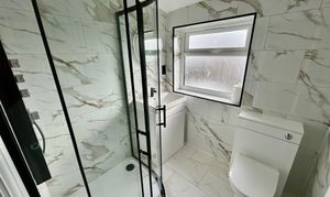 Refitted with a walk in corner cubicle incorporating shower bank, vanity unit with inset hand basin and concealed cistern w.c.