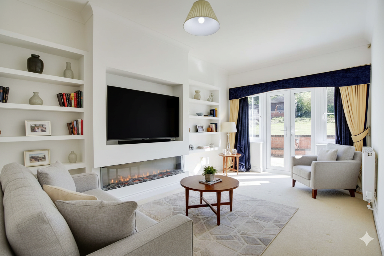 The welcoming ground floor includes a spacious entrance hall with guest WC and storage, leading to a 25ft lounge with bay window, original brick fireplace, and French doors to the garden. A formal dining room and additional reception room provide excellent entertaining space, while the well-equipped kitchen with tiled flooring is complemented by a separate utility room with outdoor access.