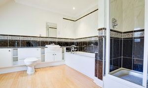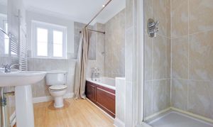 With a double-glazed window to the rear elevation, bamboo flooring, bath, walk-in shower, wash hand basin, WC, partly tiled walls, heated towel rail.