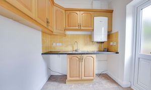 With a double-glazed door to the side elevation, tiled splashbacks, a sink and drainer unit with a range of wall and base units with work surfaces over, a boiler, space and plumbing for a washing machine and tumble dryer, radiator.