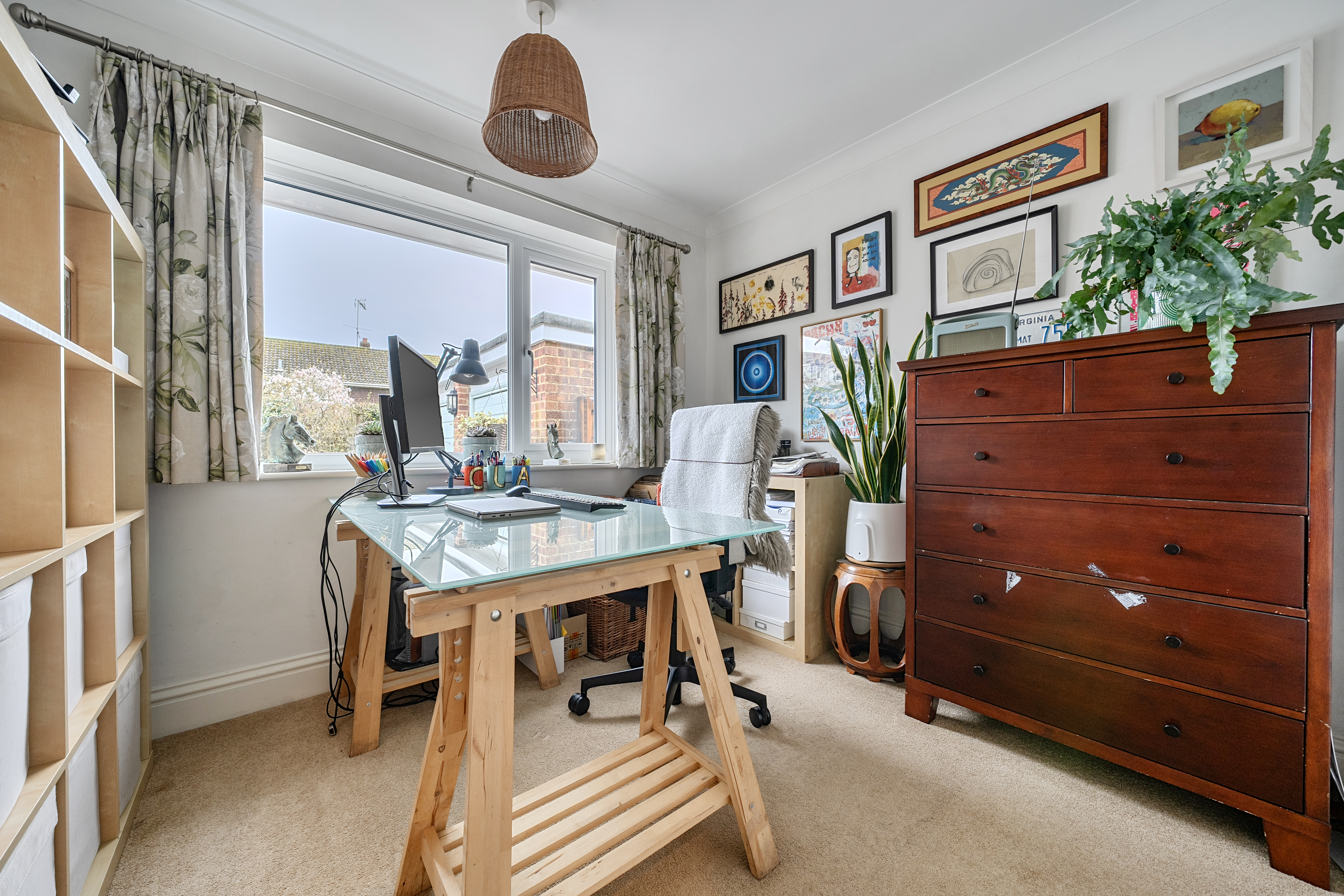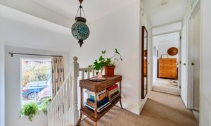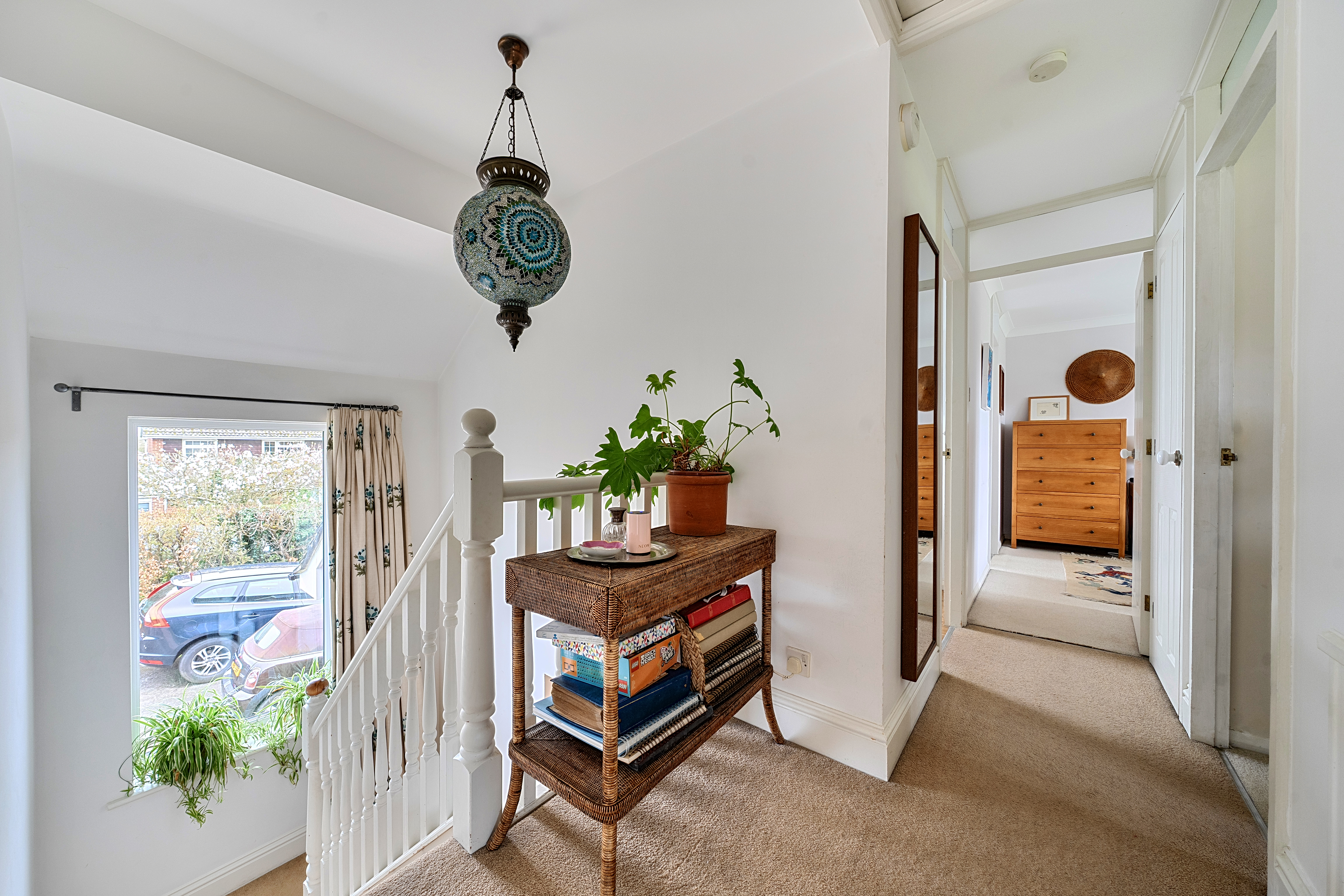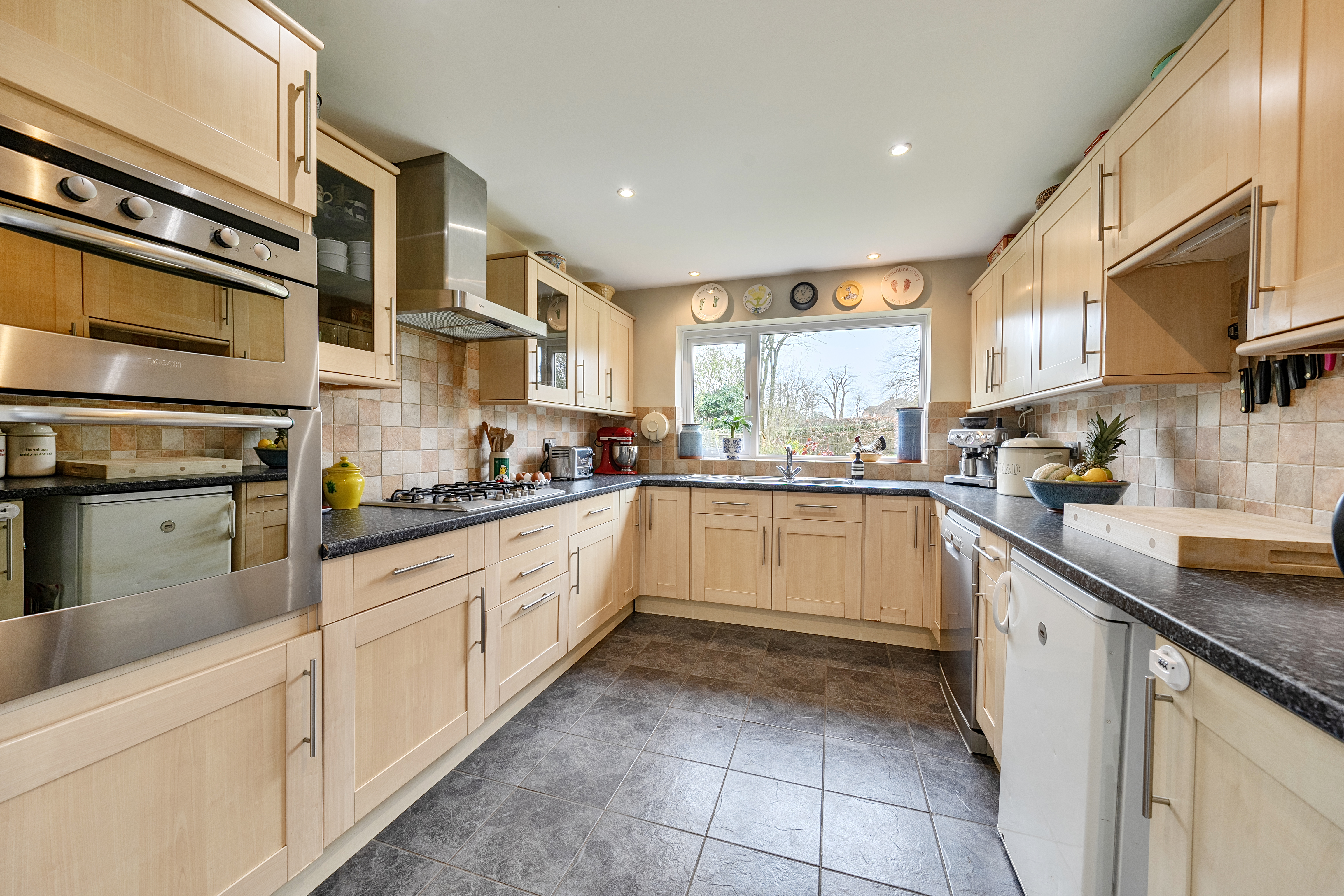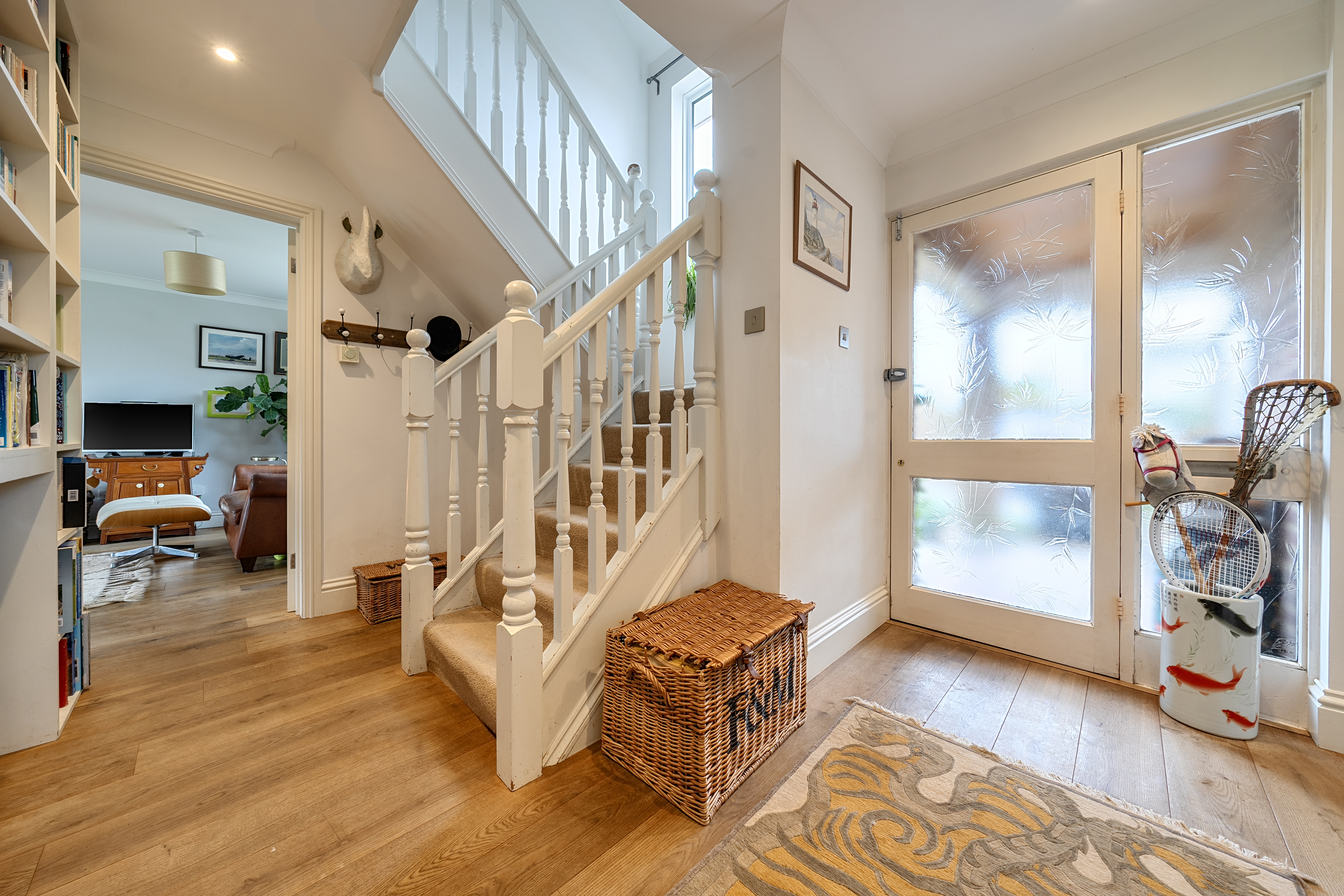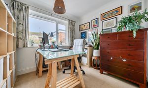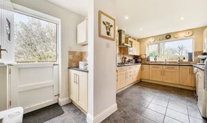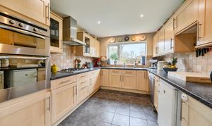 A welcoming entrance hall provides access to the downstairs cloakroom, sitting room and separate dining room. The light and airy sitting room features a charming log burner and opens through to the dining room, creating an ideal space for entertaining. Patio doors from the dining room lead out to the rear garden. The kitchen overlooks the garden and is fitted with a range of units, integrated appliances and additional space for freestanding appliances. A further reception room offers a versatile space, ideal for home working or a fifth bedroom.