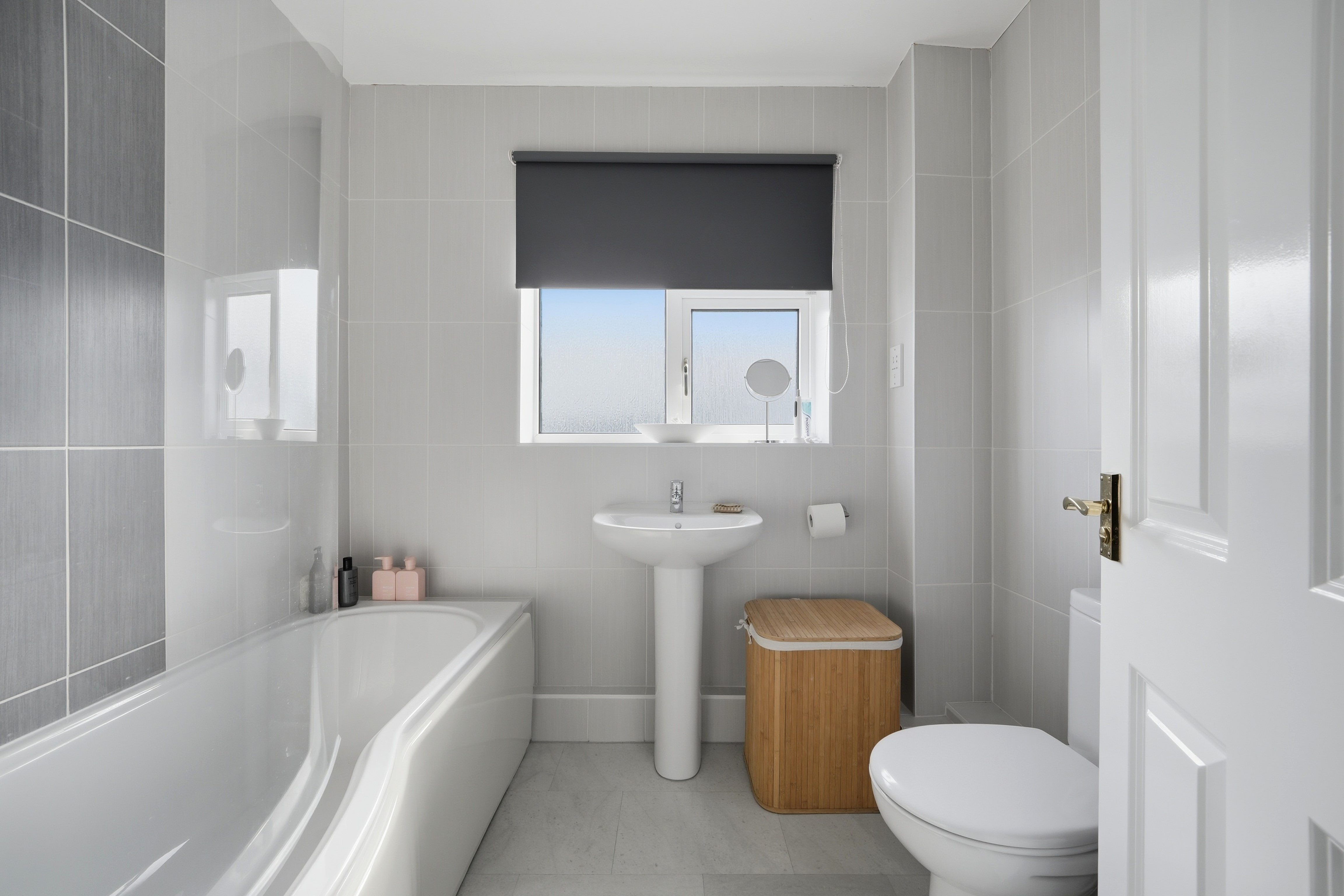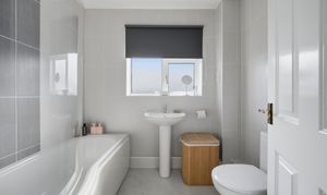 With ceiling light point, frosted uPVC double glazed window, floor to ceiling tiled walls, LVT tile effect flooring, shaver socket, large ladder style heated towel rail and fitted with a suite comprising pedestal wash basin with chrome monobloc tap, low flush WC and panelled bath with curved shower screen and a Grohe chrome shower fitting over.