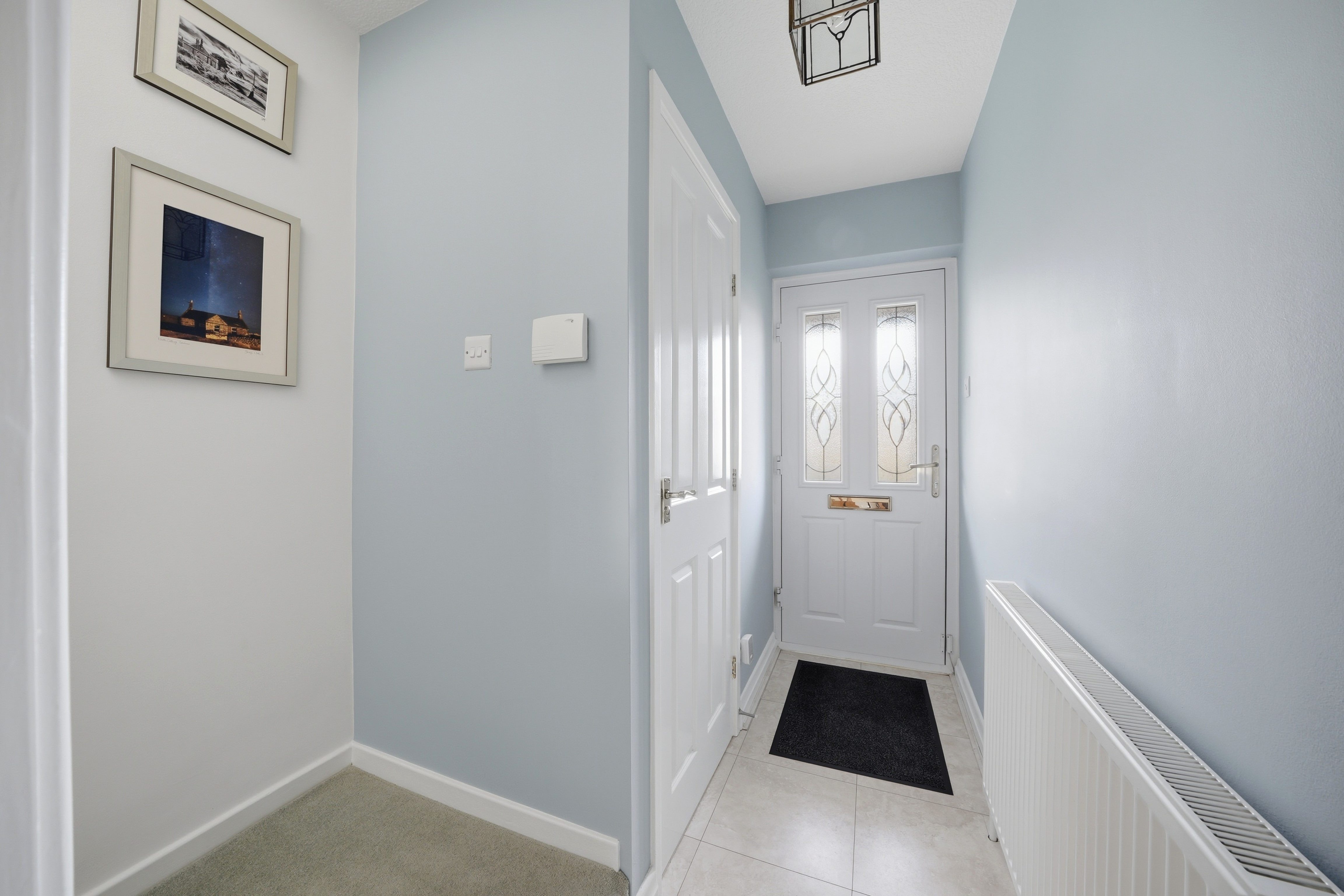 With a sliding uPVC double glazed door with adjacent uPVC double glazed window, there is a wall light point, tiled floor and from here a composite panelled and double-glazed door opens into the entrance hall.