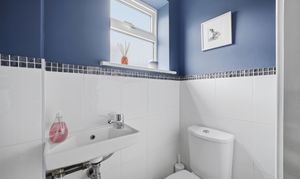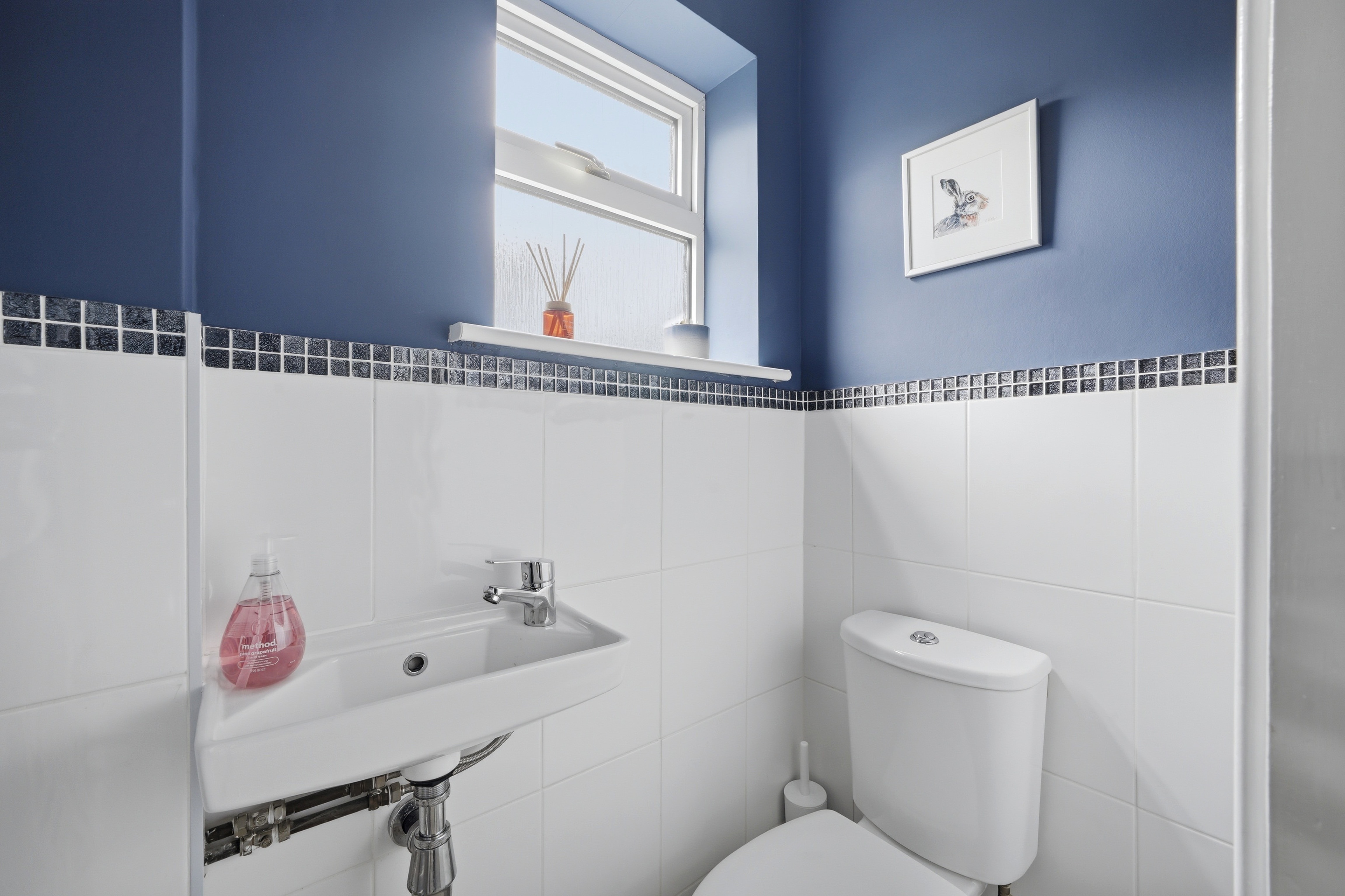 This is accessed off the hallway and has a ceiling light point, frosted uPVC double glazed window, tiled walls to dado height, click laminate tile effect flooring, chrome ladder style heated towel rail and fitted with a suite comprising wall hung handwash basin with chrome monobloc tap and low flush WC.