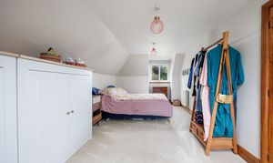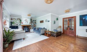 The front door leads into the hall off which is the STUDY that could be used as a fifth bedroom and a DINING ROOM. Double doors lead into the generous LIVING ROOM which has a fabulous ornate woodburner and double doors to the garden.