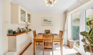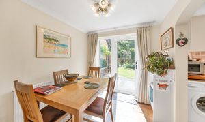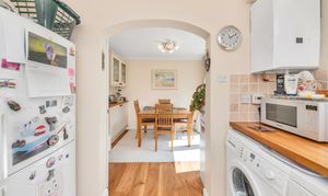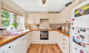 The kitchen/dining room is bright and equally a very good size, with windows and a door to a rear aspect, lovely Karndean flooring, a range of base and wall units, wood worktops, spot and pendant lighting, tiled splashbacks, an integrated oven, hob and extractor fan, and space for a dishwasher, washing machine, fridge/freezer, dining setting and other small kitchen appliances.